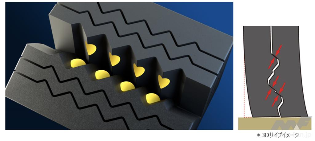 サイプ内部に半球体状の凹凸を配置することで、ブロックの倒れこみを防止。これによりドライ/ウェットおよび冬道走行時での高い操縦安定性を提供する。また、ブロックの剛性が高まることで、偏摩耗の抑制にも貢献する。