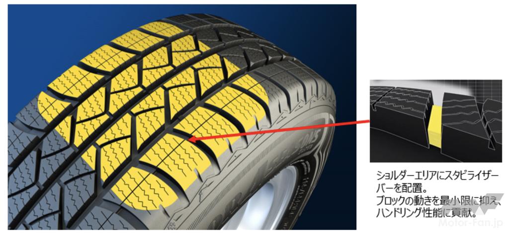 トレッド部の圧力分布を最適化することと接地路面を最大化することで、偏摩耗を抑制しつつ、氷上や雪上でのパフォーマンスをアップ。また、商用車に求められるロングライフ性能も向上させている。