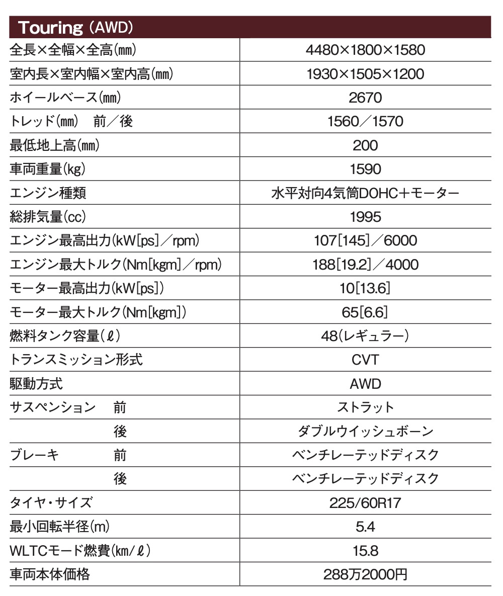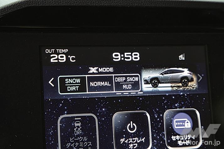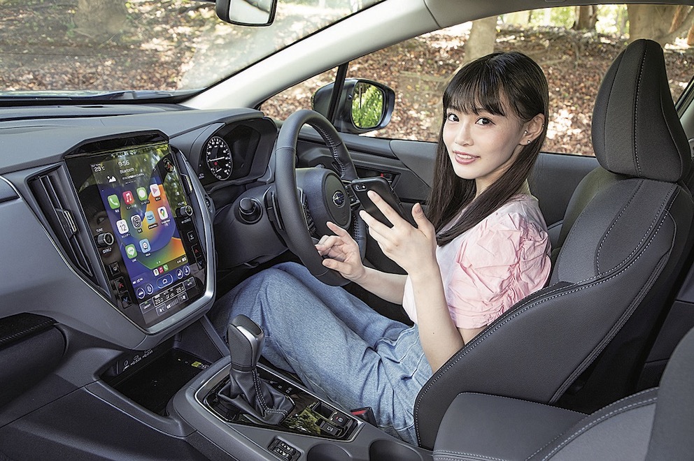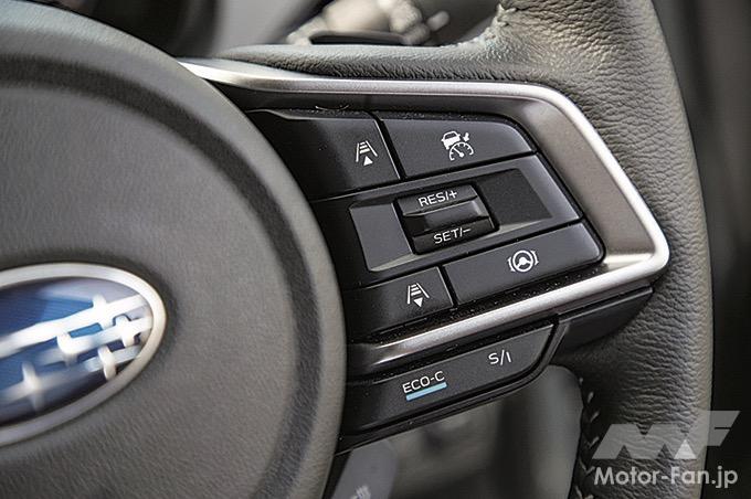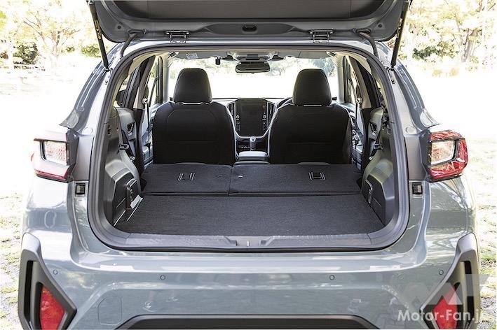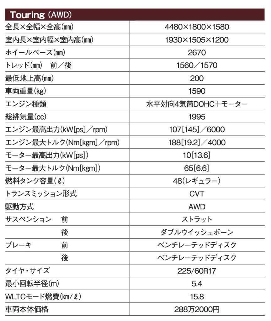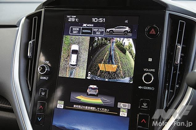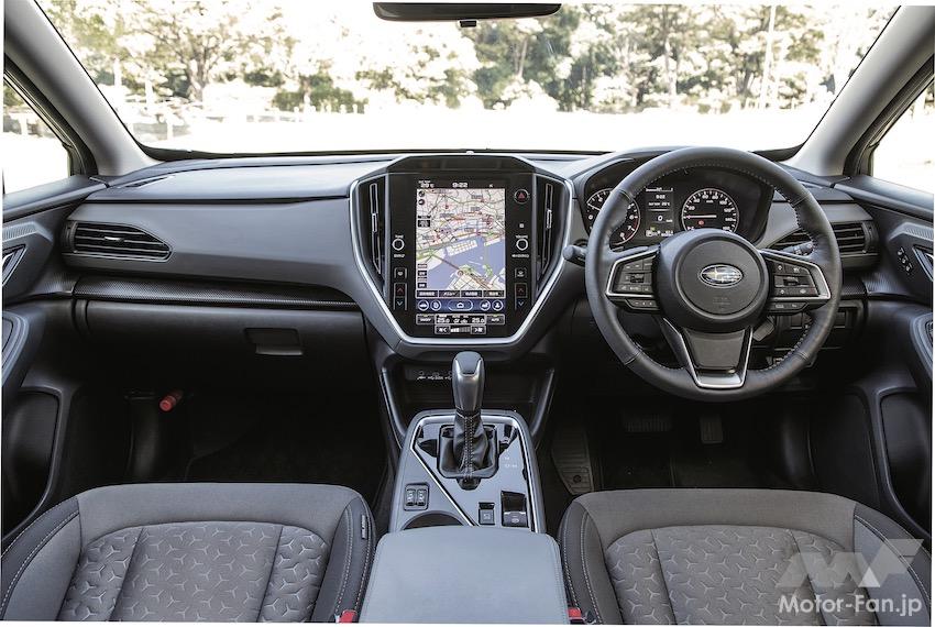 インパネなどの内装も基本的にはインプレッサと共通で、視認性や操作性が良い。ATの操作もレバーを前後に動かすタイプで、オーソドックスだが馴染みやすい。リミテッドに標準装着、ツーリングではオプション設定になる11.6インチのセンターインフォメーションディスプレイは、サイズが大きく縦長のデザインだ。カーナビの地図画面を進行方向を上に表示したとき、遠方の様子がわかりやすい。内装の装飾は控え目だが、つくり込みはていねいで質感も満足できる。