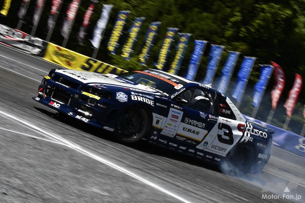「僕的には『行けただろう』って出来だったんですけど。Bグループの前半と後半でけっこう天候に大きな差があったから、車速も全然違ったし、後半はそりゃ点数出るやろっていう路面コンディションだったので、けっこう悔しいですね。でも、初めてD1GPで走って手応えはありました。DOSS(機械審査システム)も初めてつけて、最初手探りだったんですけど、スポッターもDOSSの知識があるひとにお願いしてるんで、こうしたらこんな感じで点数が出るんだっていうのがだいぶ反映されてきて、朝の練習走行はドライだったけど、全体のなかでもまあまあそこそこ点が出ていました。本番はいきなりの雨で、いまの車両とタイヤでウエットを走ったことがなかったんですけど、DIREZZA β02はウエットでもかなりいいですね。タイヤにも助けられて、やりきった感はあったんですごく悔しいです。次戦の筑波までにはパワーアップもしたいなと思ってるんで、いい走りができるように頑張ります」。