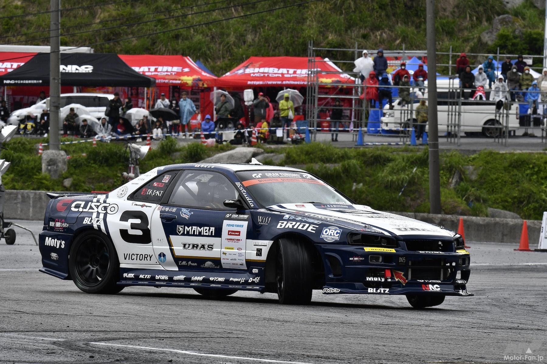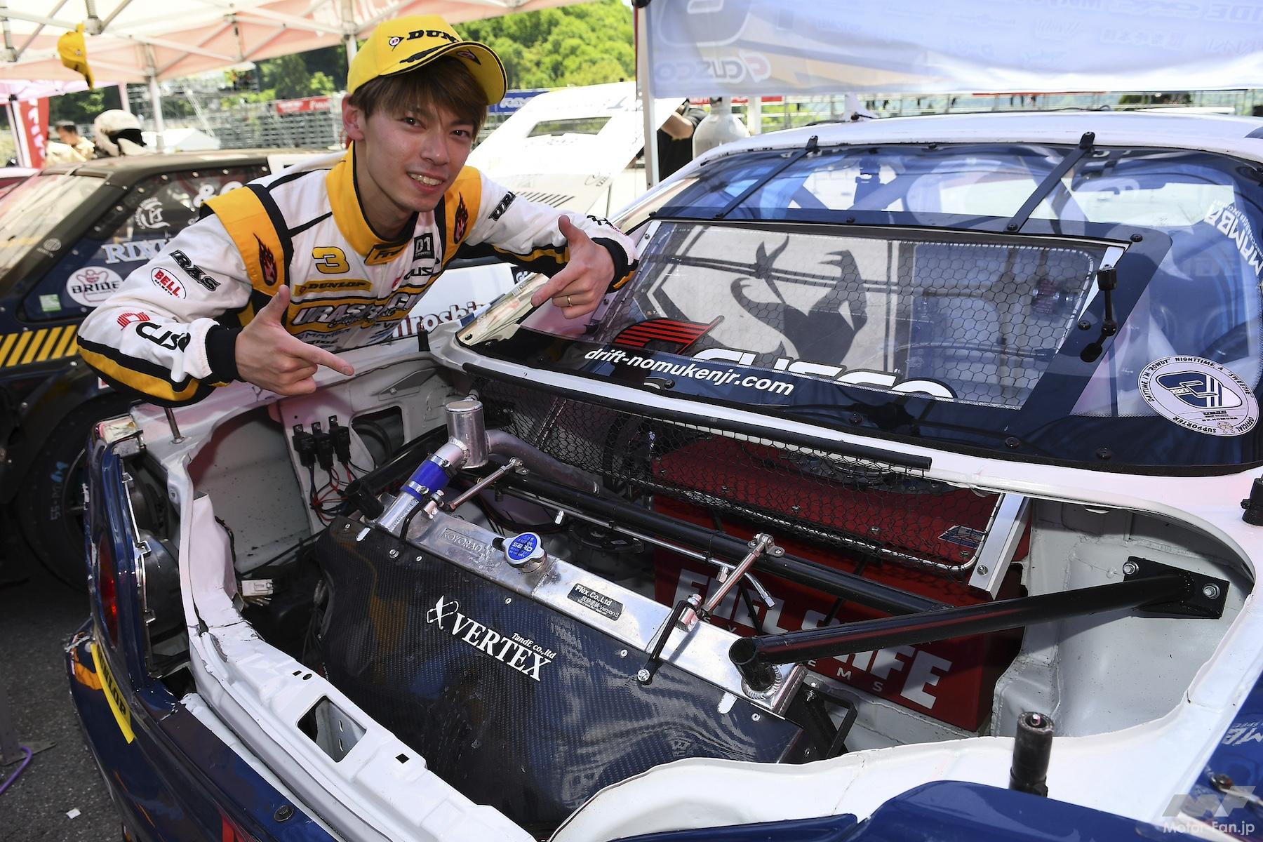 「僕的には『行けただろう』って出来だったんですけど。Bグループの前半と後半でけっこう天候に大きな差があったから、車速も全然違ったし、後半はそりゃ点数出るやろっていう路面コンディションだったので、けっこう悔しいですね。でも、初めてD1GPで走って手応えはありました。DOSS(機械審査システム)も初めてつけて、最初手探りだったんですけど、スポッターもDOSSの知識があるひとにお願いしてるんで、こうしたらこんな感じで点数が出るんだっていうのがだいぶ反映されてきて、朝の練習走行はドライだったけど、全体のなかでもまあまあそこそこ点が出ていました。本番はいきなりの雨で、いまの車両とタイヤでウエットを走ったことがなかったんですけど、DIREZZA β02はウエットでもかなりいいですね。タイヤにも助けられて、やりきった感はあったんですごく悔しいです。次戦の筑波までにはパワーアップもしたいなと思ってるんで、いい走りができるように頑張ります」。