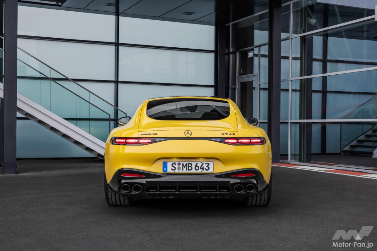 新型メルセデスAMG GT 43クーペは、比較的軽量なフロントの4気筒エンジンと純粋な後輪駆動の組み合わせにより軽快なコーナリングパフォーマンスを発揮し、ハイレベルなドライビングの楽しさが実現されている。フロントに搭載されるAMG 2.0L 4気筒ターボエンジンは最高出力421PS/6750rpm、最大トルクは500Nm/3250~5000rpmを発生。状況に応じて、ベルト駆動のスターター・ジェネレーターによる14馬力の短時間の追加ブーストが加えられる。これにより、0-100km/h加速は4.6秒を達成し、最高速度は280km/hに達する。