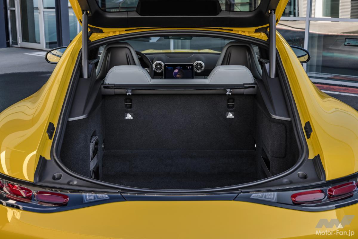 AMG独自のスポーツカー・アーキテクチャーが、オプションの2+2シーターによるゆとりあるプロポーションを可能にしており、このクラスのスポーツカーとしては、長時間の移動でも非常に広々と感じられ、荷物スペースも十分に確保されている。大型のイージーパック・テールゲートは、ハンズフリーアクセス機能も備えており、荷物の積み降ろしを容易にしている。必要に応じて、分割可倒式リアシートバックレストを使用してラゲッジルームを大幅に拡張することも可能だ。
