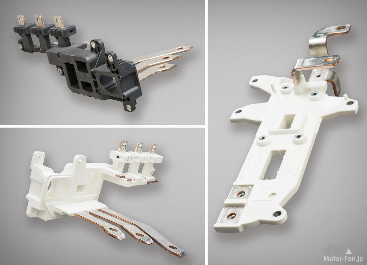 自動車のパワートレインは現在、内燃機関から電動機関へ急激な転換が進んでいる。充電部品からバッテリー、そしてバッテリーから電気モーターへ電気を送るため、高効率なバッテリーシステムがエレクトロモビリティの成功のカギとなる。その電流の導電には、金属製のバスバーが使用される。今回開発されたプラスチック製のオーバーモールドは、バスバーの電気絶縁性を確保し高電圧電流の安全な分散に貢献する。