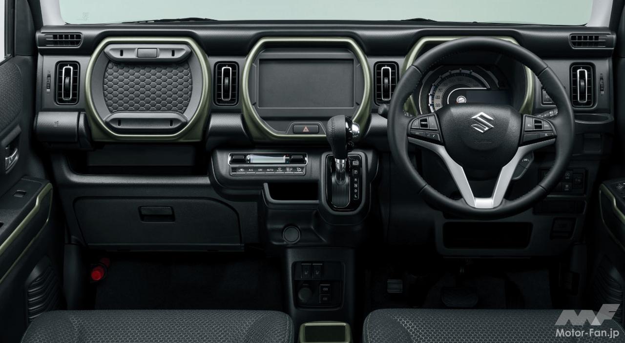 さらにHYBRID XとHYBRID Xターボは、エクステリアにHUSTLERアルファベットエンブレムやメッキフォグランプガーニッシュ、メッキドアハンドルを採用したほか、インテリアにはダークグレーのレザー調&ファブリックシート表皮やブラックパールのインパネカラーガーニッシュなどを採用し、質感をさらに高めている。