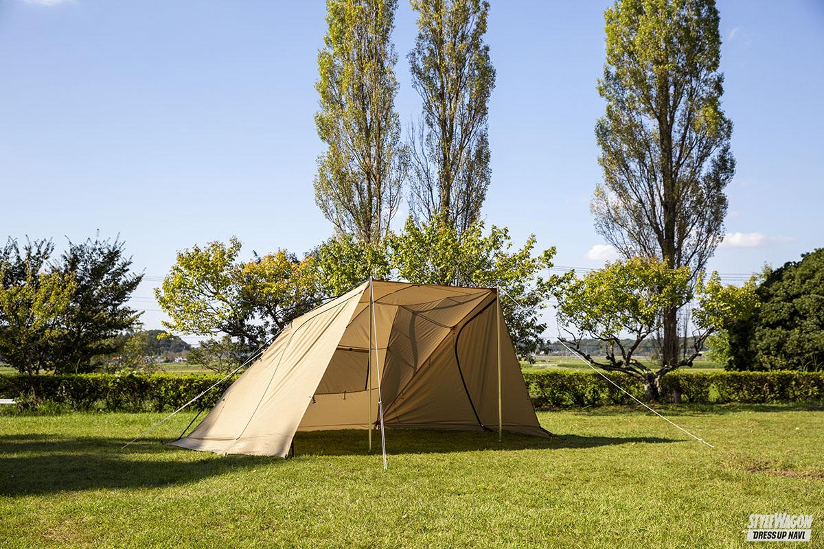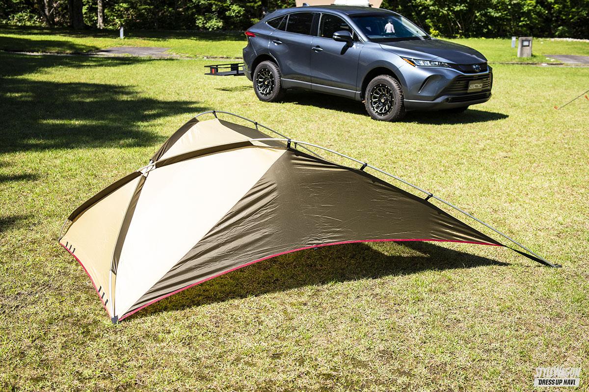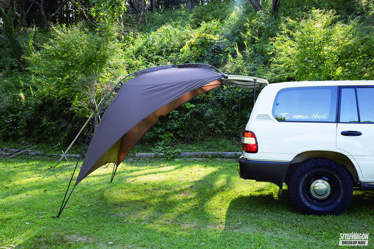 アイテム(カスタム) 簡易シェルターとしてもオススメ【銘柄決め打ちでチェック!】オガワ・カーサイドタープ【写真・4枚目】 囲まれ感と安心感があるカーサイドタープ。中に空気がこもらず適度な開放感も。ソロからファミリーまで海や山で遊ぶ際の簡易シェルターとしてもオススメ。 メインの壁面には大型メッシュ窓を装備。同モデル最新のALⅡでは窓の開閉が可能なフラップも装備されている。 メッシュ窓越しに見えるリビングのガソリンランタン。こんなムーディーさも味わえるお洒落ギアだ。 重量は片手で持てる約2.5kg。収納時もコンパクトで車中の収納に困らない58×12×12cmサイズ。 1 タープを地面に広げ付属のポール2本をガイドに通す。ポールはゴムロープ入りで簡単。 2 ポールの端を補強の入ったタープ生地の端に固定。こちらはボディに装着する吸盤側。 3 逆サイドの着地部分にもポールの端を固定する。こちらは付属の金具を差し込む要領で。 4 差し込んだポールに、タープに付属されているフックをパチンパチンと全部ハメていく。 5 組み立て状態はこんな感じ。風に煽られ車体に傷をつけないよう吸盤側を車体に寄せる。 6 左右2箇所の吸盤を車体天井部分に取り付け、地面側にペグを打ち込み固定すれば完了。 この画像の記事を読む