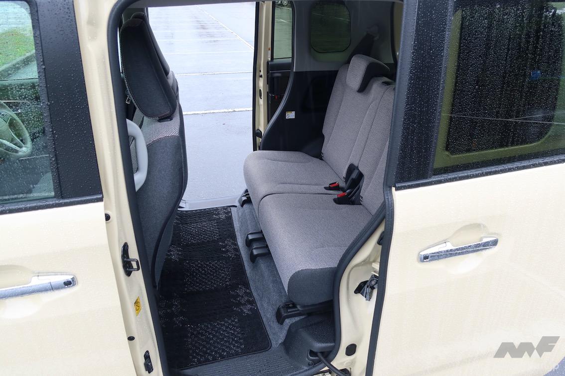 有り体に言ってしまえば、ワゴンRスマイルはダイハツ・ムーブ・キャンバスを意識して開発されたクルマだ。ムーブ・キャンバスのウリのひとつは後席の下に引き出し収納を備えていること。スライドドアを開けてこのボックス状の収納に買い物袋などの不安定な荷物を載せると、走行中に倒れる心配が薄れる。