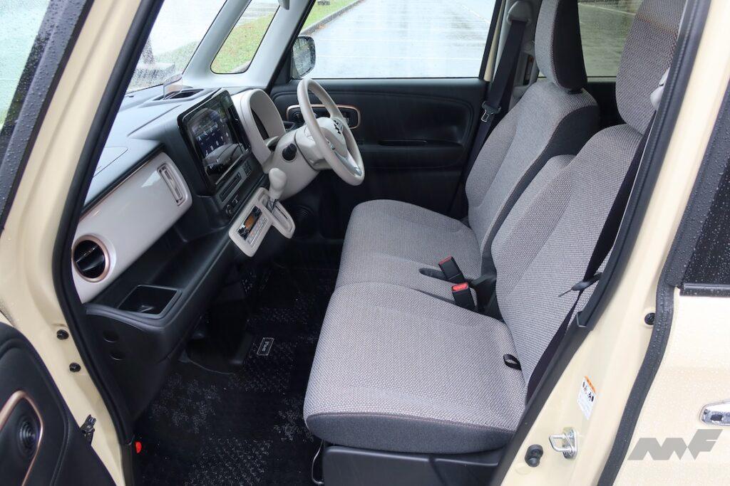 エクステリアと同様にインテリアも丸みを帯びた処理が多用されており、雰囲気は柔らかい。インパネとドアトリムにステッチ風の模様を施し、革を手縫いしたような質感を表現している。よく観察すると、ドアの内張りはワンピースの樹脂成形品である。サイドウインドウ側のシボとステッチ、ステッチの内側にある織り模様は質感高く再現されており、安っぽさを微塵も感じさせない。軽自動車を作り慣れたスズキ(と協力企業)の技術力の高さを見せつけられる思いだ。