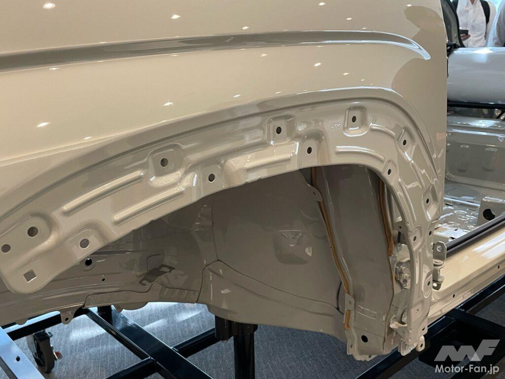 一見すると、ただの製造途中のクルマのボディであり、面白みのない鉄の塊のようにみえるが、そこにはクルマの安全性や耐久性に大きく影響する設計がなされていると、スズキの解説員は教えてくれた。