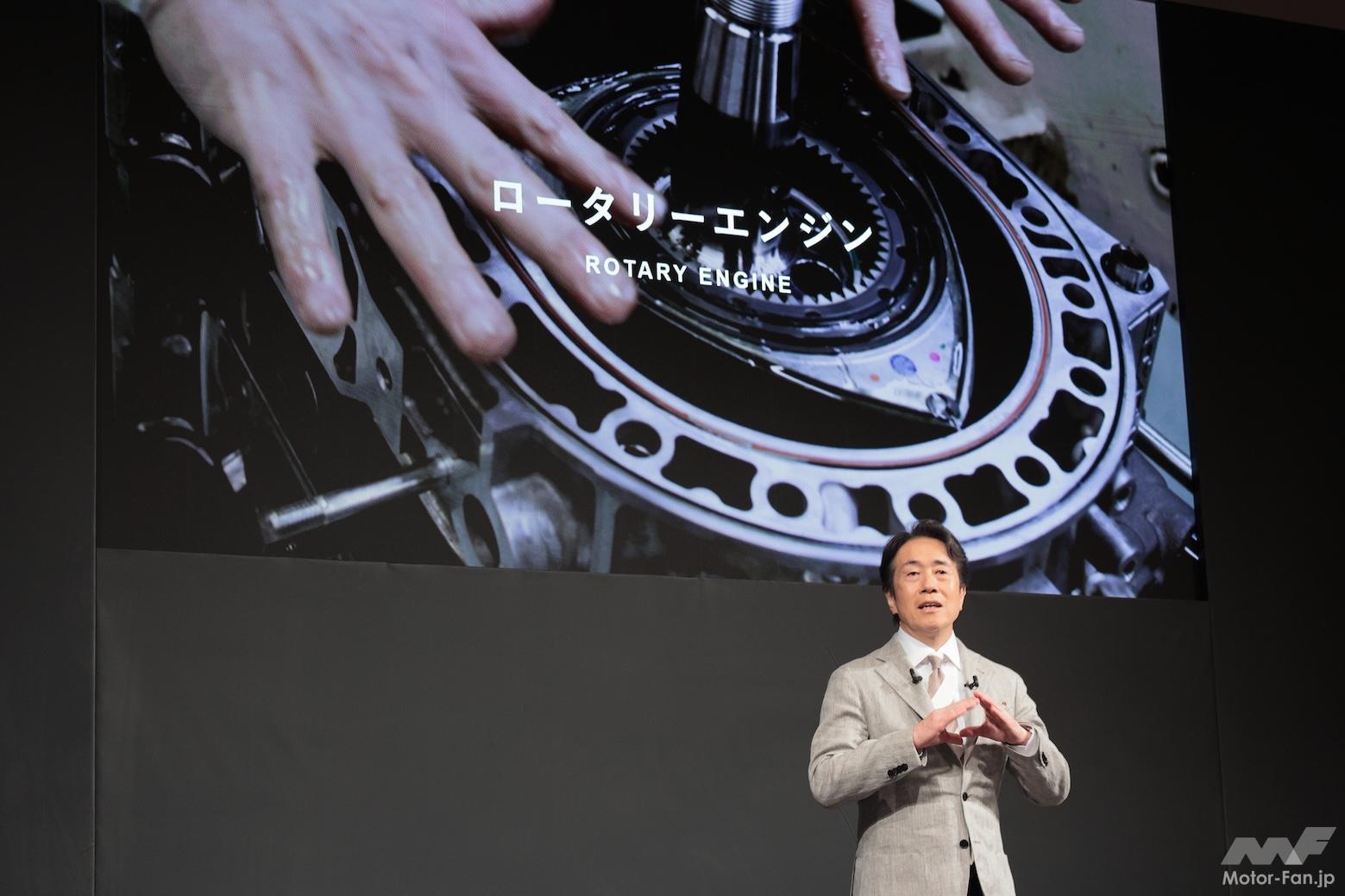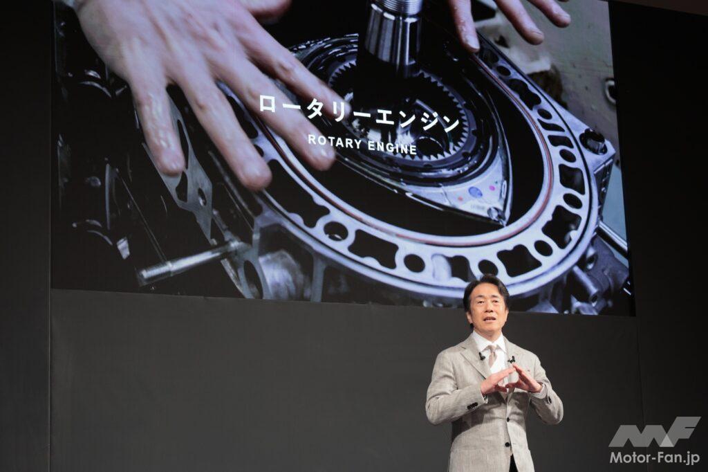 マツダが示したのは、電動化時代のロータリーエンジンである。廣瀬一郎CTOは、「使用エネルギーを節約する観点でエンジンの効率を改善し続ける。そのいっぽうで、エンジンは次の3つを進めていくことが重要」だと説明した。