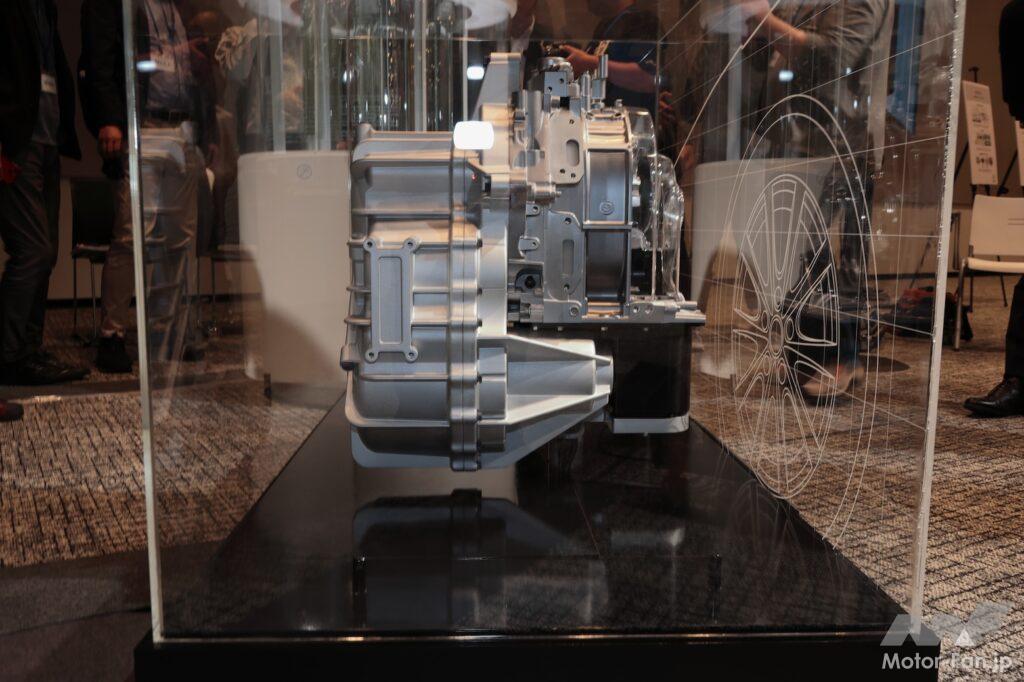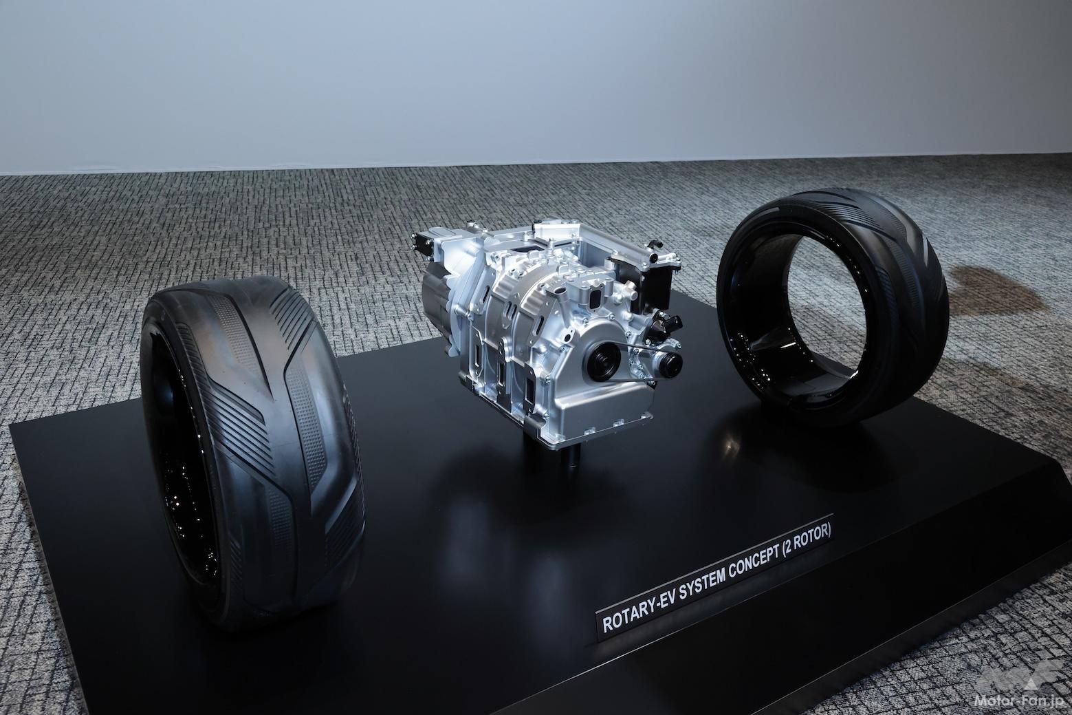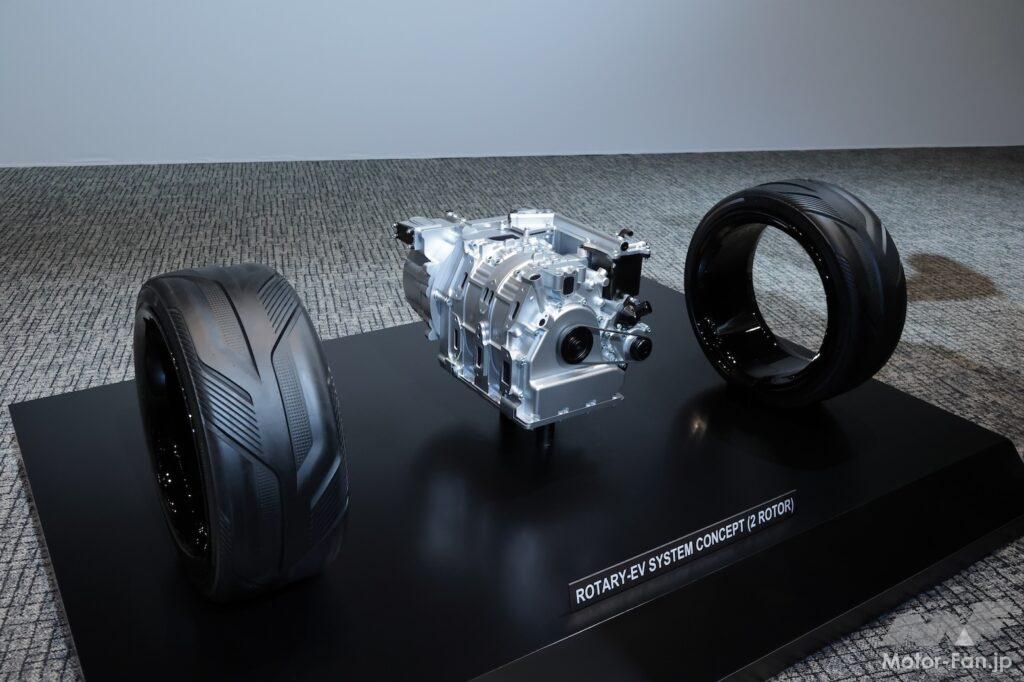 ROTARY-EV SYSTEM CONCEPT(2 ROTOR)は、2本のタイヤに挟まれた状態で展示されていた。その様子から、縦置きレイアウトであることが見てとれる。パワーユニット全体がコンパクトなのもさることながら、タイヤがあることで、極めて低い位置に収まっていることも見てとれる。