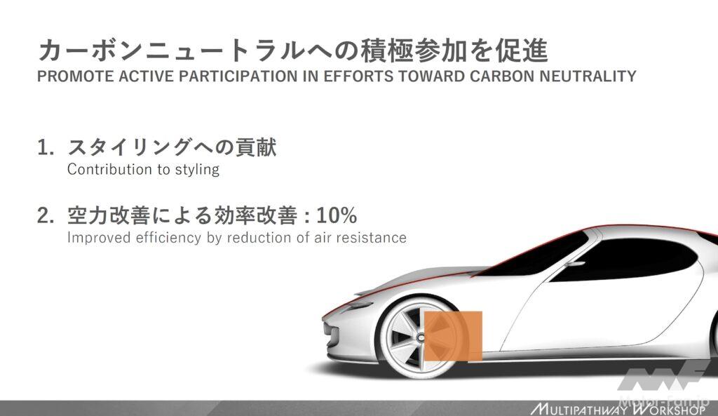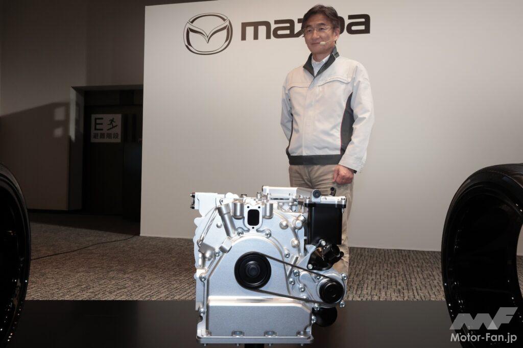 エミッション低減はロータリーエンジン自体で取り組んでいくのと並行し、電気を使って冷間時にエンジン本体や触媒を温めることで可能になると考えている。カーボンニュートラル燃料への対応については、ロータリーエンジンの構造的な特徴が生き(例えば、熱効率の観点では不利だが、火種が強く押し出される燃焼をするので、燃えにくい燃料も燃やせる)、レシプロエンジンが苦手とする燃料にも対応できる。