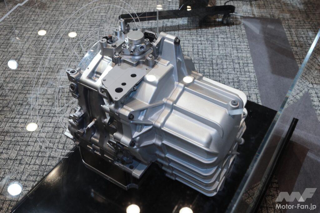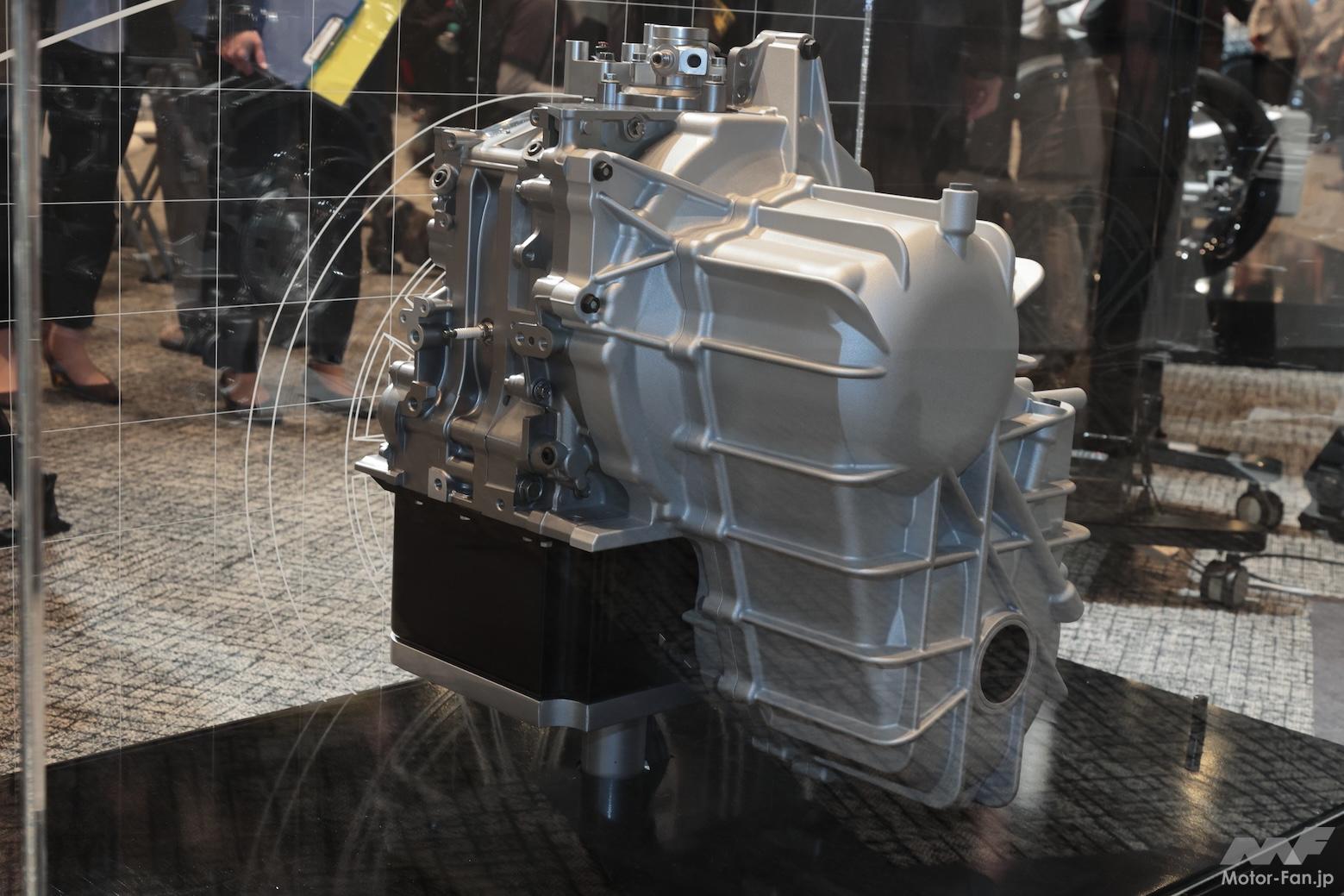 いっぽう、ROTARY-EV SYSTEM CONCEPT(1 ROTOR)は、エンジンの動力が直接タイヤに伝わる構造になっており(と、想像できる)、そこがe-SKYACTIV R-EVとは決定的に異なる。補強リブが入ったケースを見ると、上側に発電用モーターと動力分割機構、下側に駆動用モーターを配置した構成と想像できる。