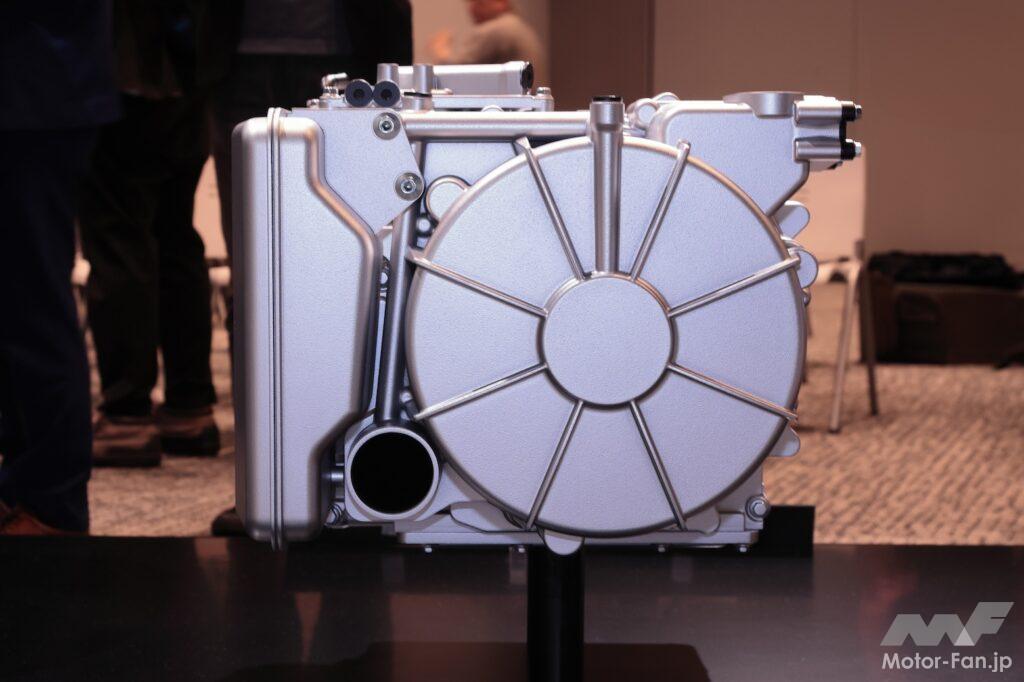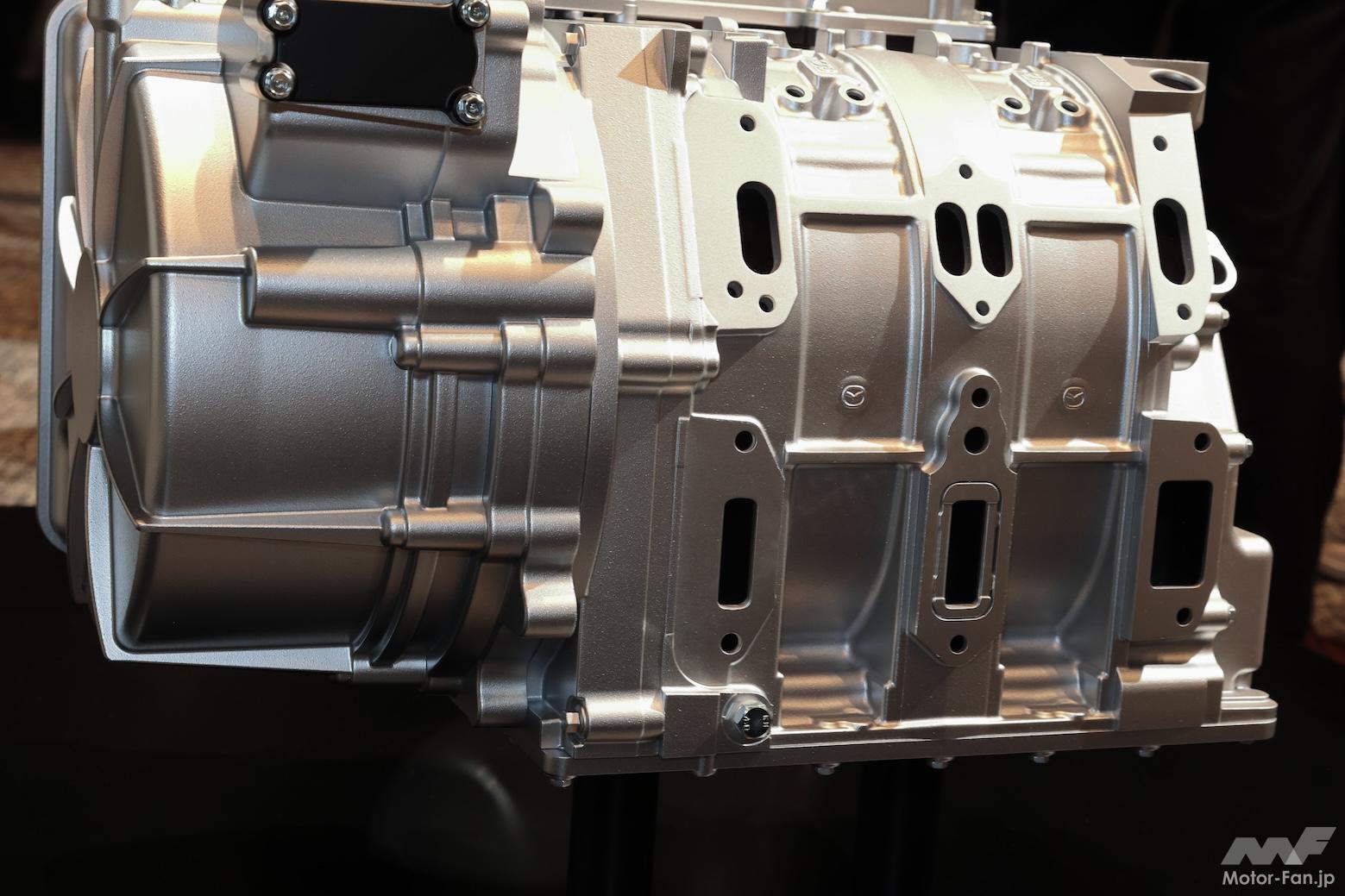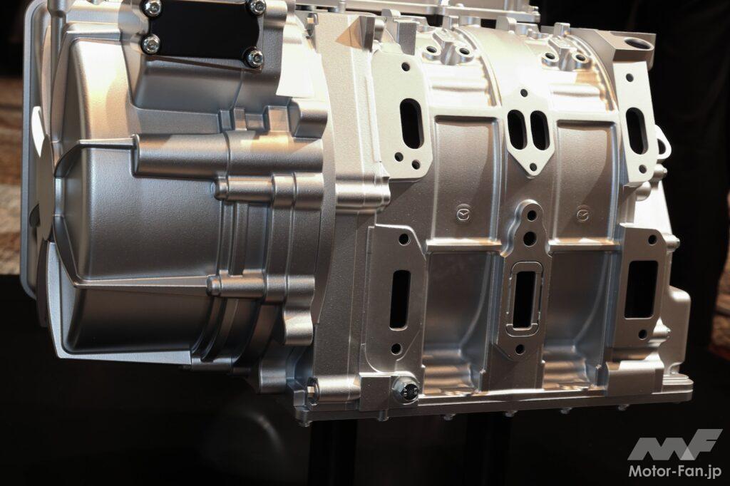 1ローターの電動化ユニットなら、MX-30ロータリーEVが搭載するe-SKYACTIV R-EVがある。それとは違うユニットであることは一目瞭然だ。e-SKYACTIV R-EVは車載状態で右側から駆動用モーター、発電用モーター(ジェネレーター)、8C型ロータリーエンジンの順に並んでいる。