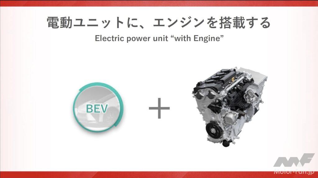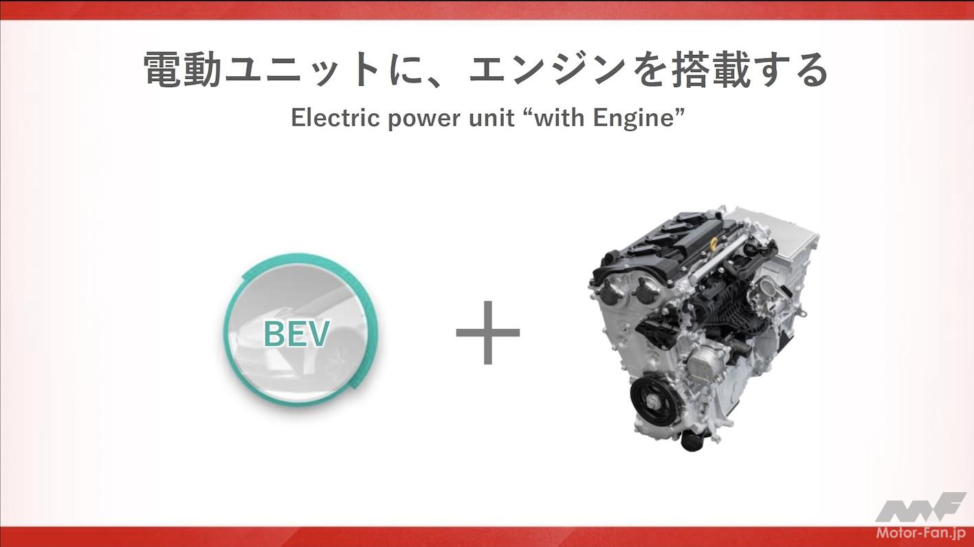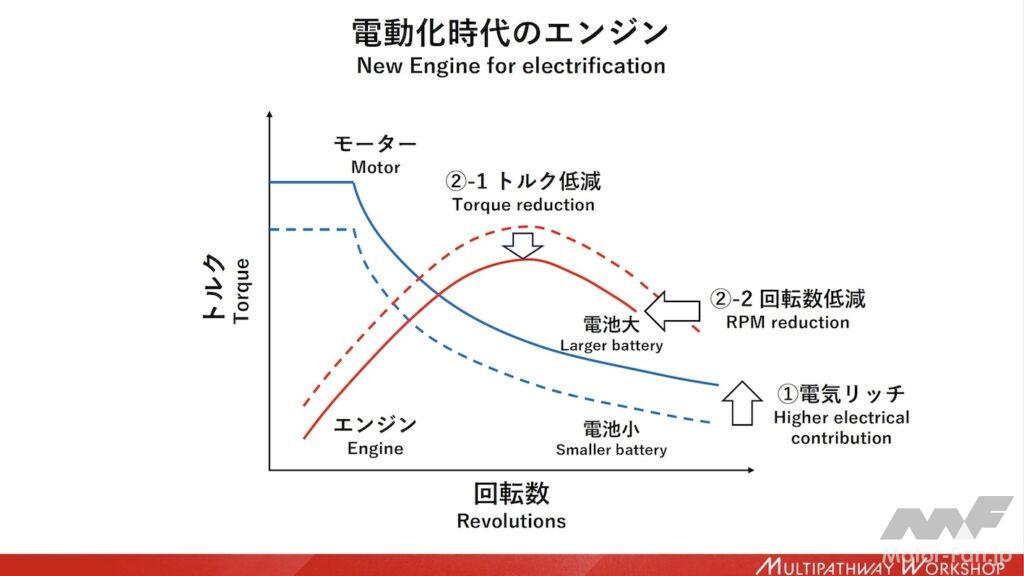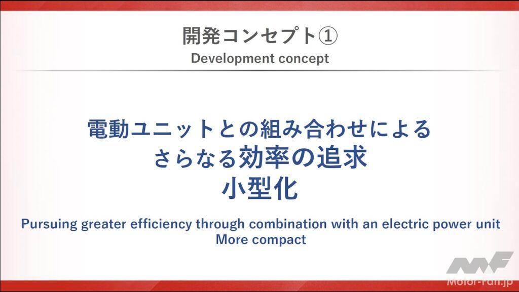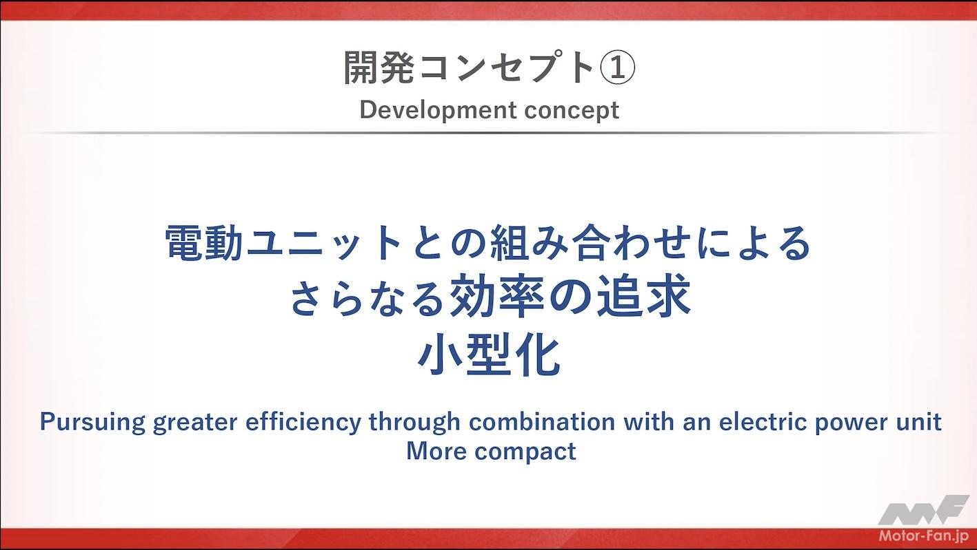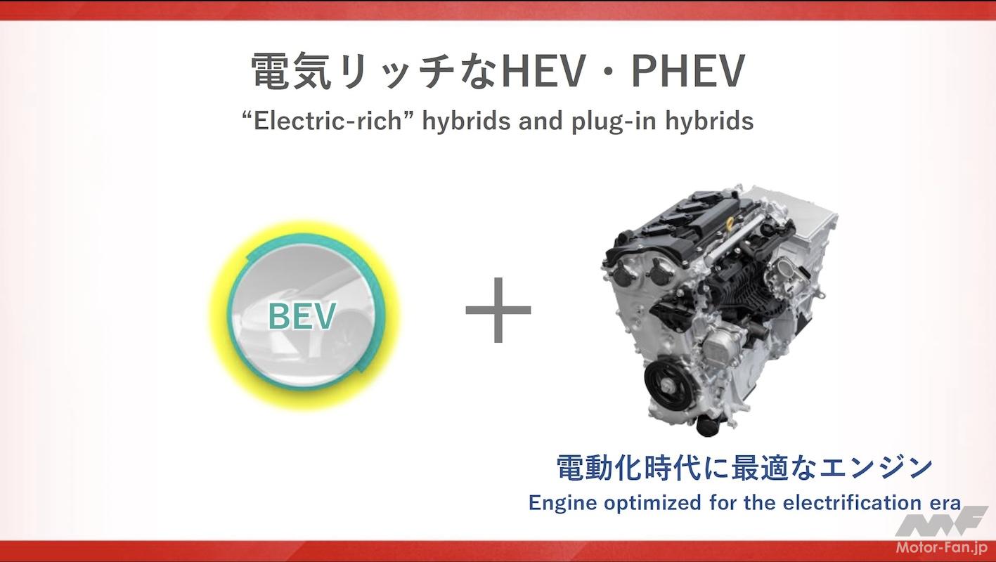 新エンジンは電気リッチ(高出力モーター+大容量バッテリー)でも電気リーン(小出力モーター+小容量バッテリー)でも対応できる柔軟性の高い設計としている。例えば電気リッチにした場合はモーターの出番を多くすることができるので、エンジンは楽をでき、回転数を下げたり、トルクを下げたりして使うことができる。電気リーンの場合はその逆だ。中嶋CTOは、「電動化とマッチングしやすいよう、エンジン本体を鍛え直しました。従来のエンジンとはまったく異なる発想で構成しています」と付け加えた。