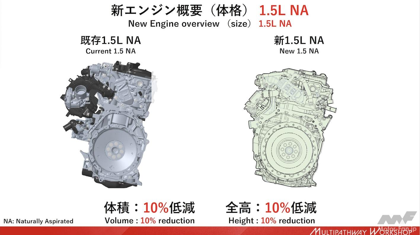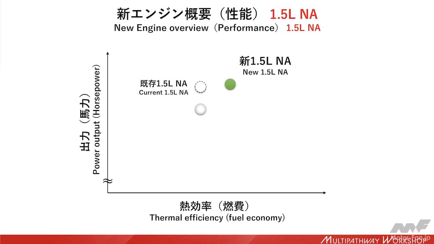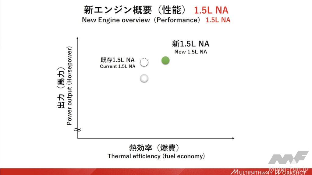 横軸に熱効率(燃費)、縦軸に出力をとったグラフでは、新1.5L NAは既存1.5L NAに対して熱効率は大きく向上し、出力もわずかながら向上することを示している。既存1.5L NAの破線の丸は現行の排ガス規制で見た場合、実線の丸は(ユーロ7など)次期排ガス規制に適合させた場合の位置づけだ。現行機種で次期排ガス規制に対応させようとした場合は出力を落とさざるを得ないが、新開発エンジンは織り込み済みの設計としているのでその必要はないことを示している。