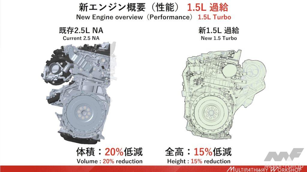 新1.5L過給の場合、比較対象は現行2.5L直4NAとなる。排気量が4割小さいことも生きて全高は15%低く、体積は20%低減できる。既存2.5L NAを新しい排ガス規制に適合させるには、出力を30%落とさなければならないが、北米では3列シートSUVに設定されるこのエンジンの出力が30%下がったのでは、商品力を維持できない。だから、「新しいエンジンが必要」なのだ。