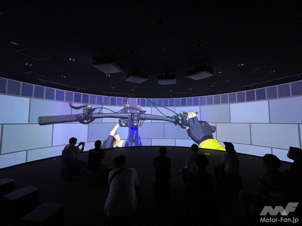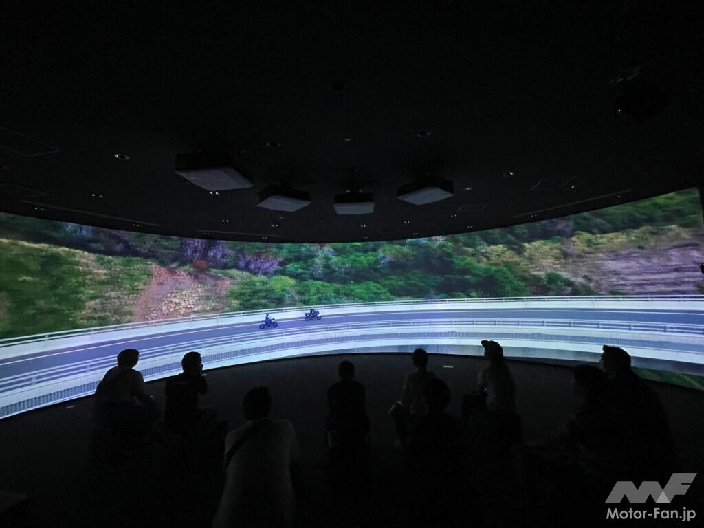 半円形のシアタールームとなっており、ヤマハのモビリティをアピールする映像を大画面で見ることができる。特にこのYAMAHA e-RIDE BASEのメインコンテンツであるeBikeのプロモーション映像は、視聴者にeBikeへの興味を掻き立てる。