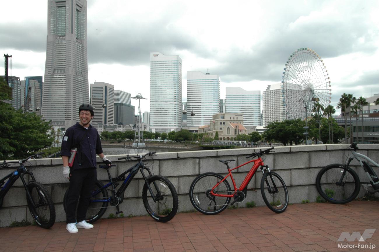 スポーツ系電動アシスト自転車eBikeに乗って、横浜のおすすめスポットを周遊。約1時間半の体験ができる。スタッフのガイドにより自転車ビギナーでも安心して参加できる。