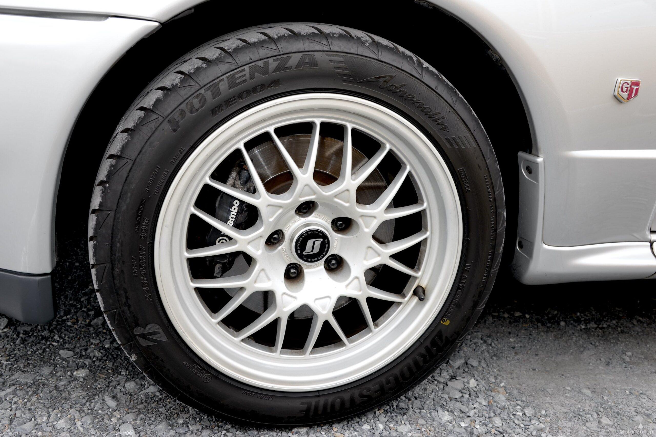 販売もレースも絶好調だったスカイラインGT-Rには年々改良が続けられ、’93年のマイナーチェンジではブレーキ径の大型化となるブレンボ製キャリパー+ディスクローターを装備しつつ、17インチBBSホイールを採用する上級グレードとしてVスペックが追加されている。さらに翌年、Vスペックのタイヤサイズを拡大して225/50R17から245/45R17へとしたVスペックⅡが発売された。