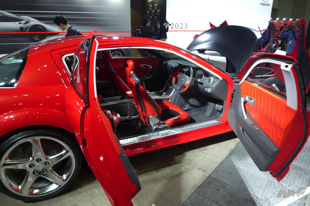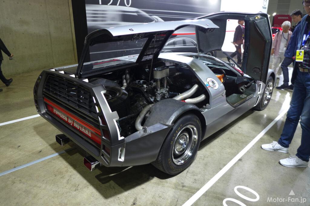 その後、筆者と樹崎さんは国産旧車を展示していたヴィンテージ宮田、マセラティ、三菱自工と会場外周を回ってマツダブースにやってきた。今回のマツダは「ロータリースポーツカーコンセプトの歴史と未来」をテーマに、1967年に発表されたRX500、1999年に発表されたRX-EVOLV、昨年発表されたMAZDA ICONIC SPの3台のコンセプトカーを展示していた。その中で樹崎さんが反応したのがRX500だった。