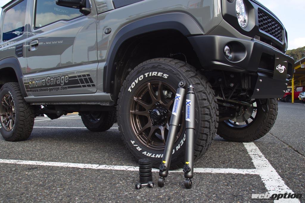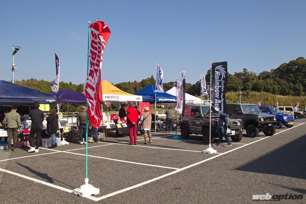 パドック内には出展社のテントが並び、カスタムパーツの展示に参加者達も興味津々。なかでも注目したいのが、完成したばかりという“ショーワガレージ”のJB74Wシエラだ。