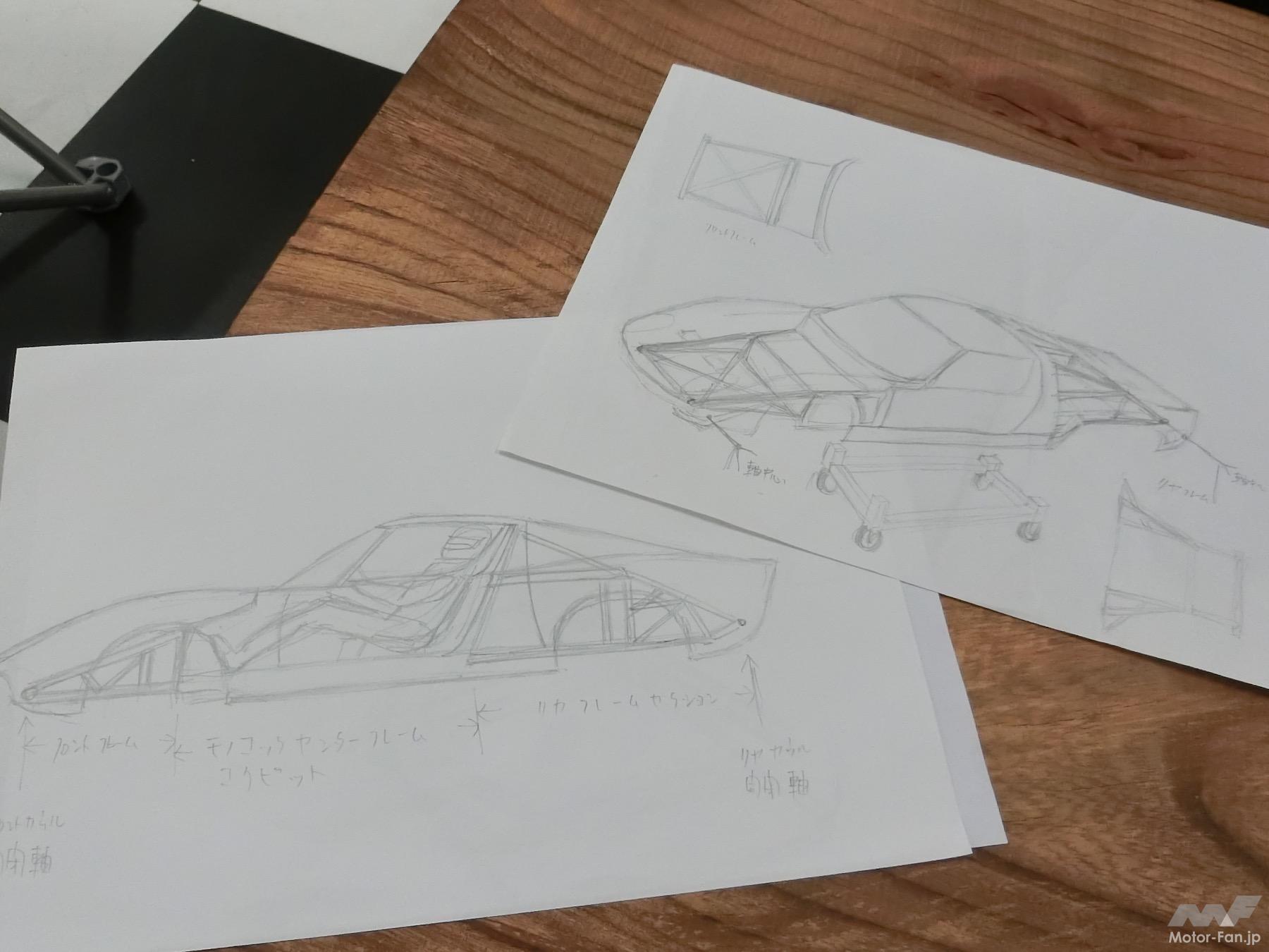 この絵本と並行して、ジウジアーロに学んだイタリアンスタイルの、グレーの紙にペンシルとパステルなどを使ったエレベーションスケッチ(横、前後、俯瞰からの形を描いたドローイング)を、イオタの形を探りながらフランチェスコさんに描いていただけました。