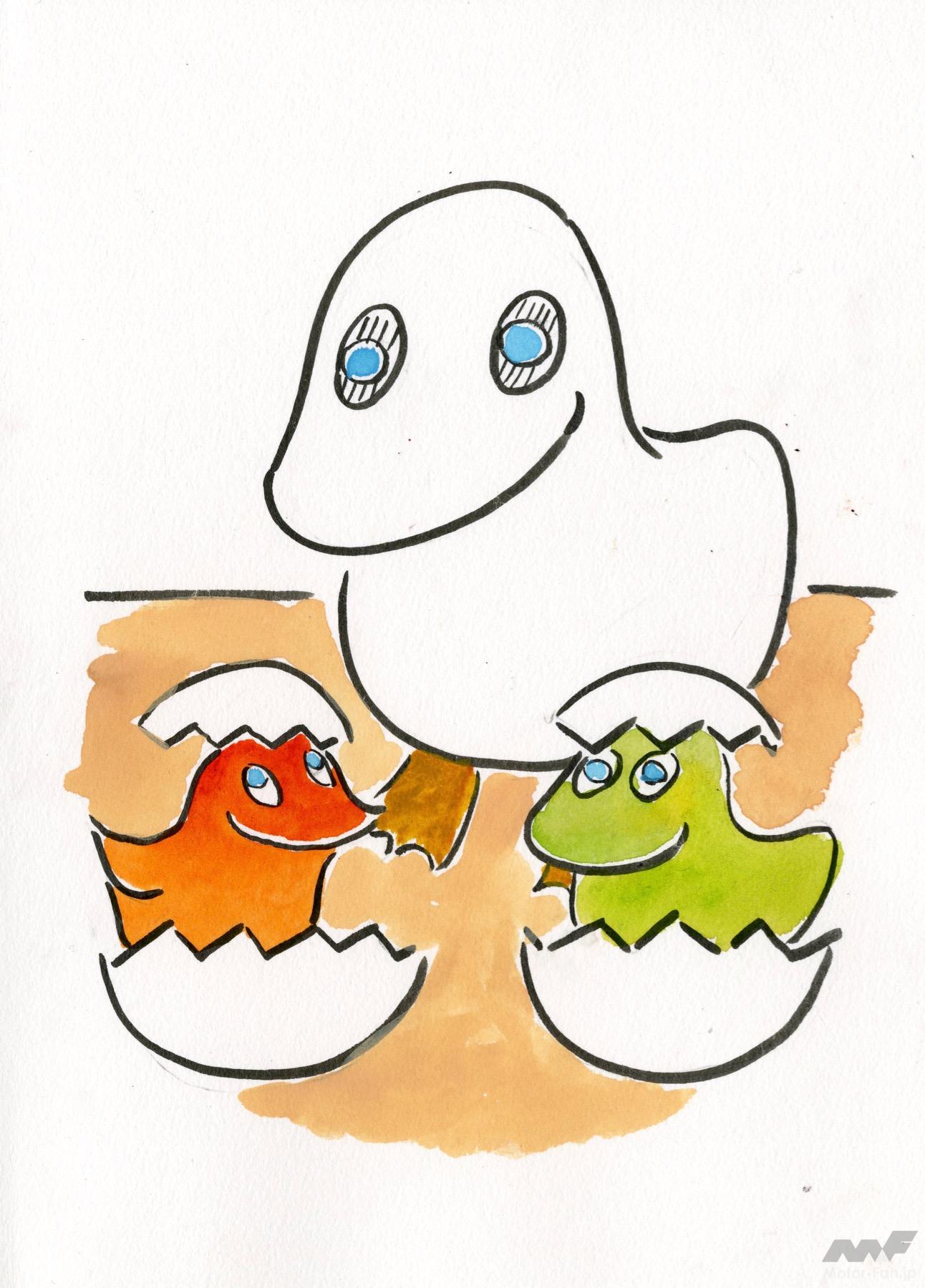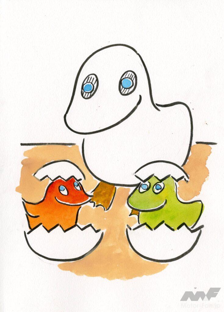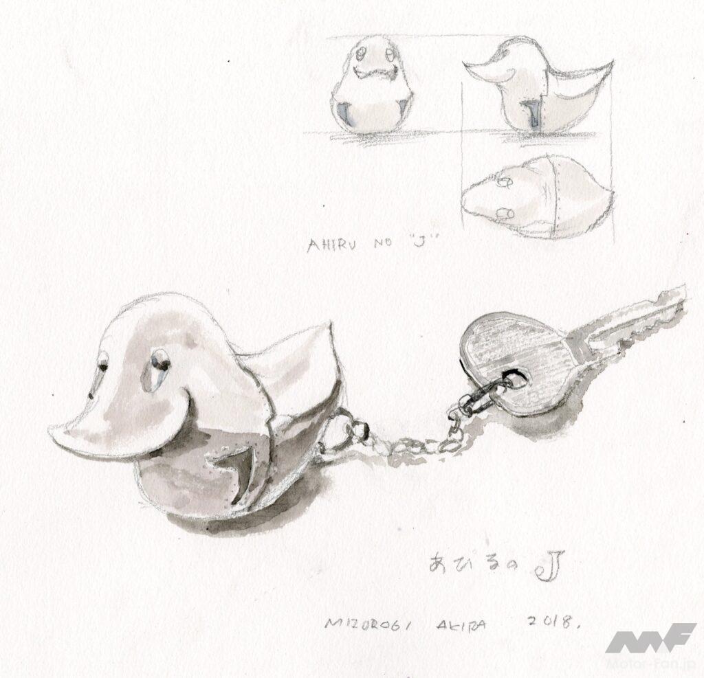 そこで、その場でスケッチしたのが、アヒルの形をしていて目がイオタのライト、くちばしは尖ってピンと立ったしっぽの、イオタJの特徴を入れた、『アヒルのジェイ』というキャラクターでした。その場で目がミウラの形をしたアヒルやカウンタックの特徴を入れた白鳥も思いつき、赤間氏がストーリーを考えることに。