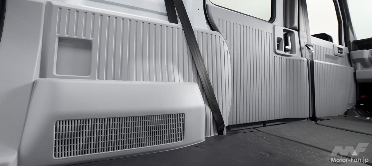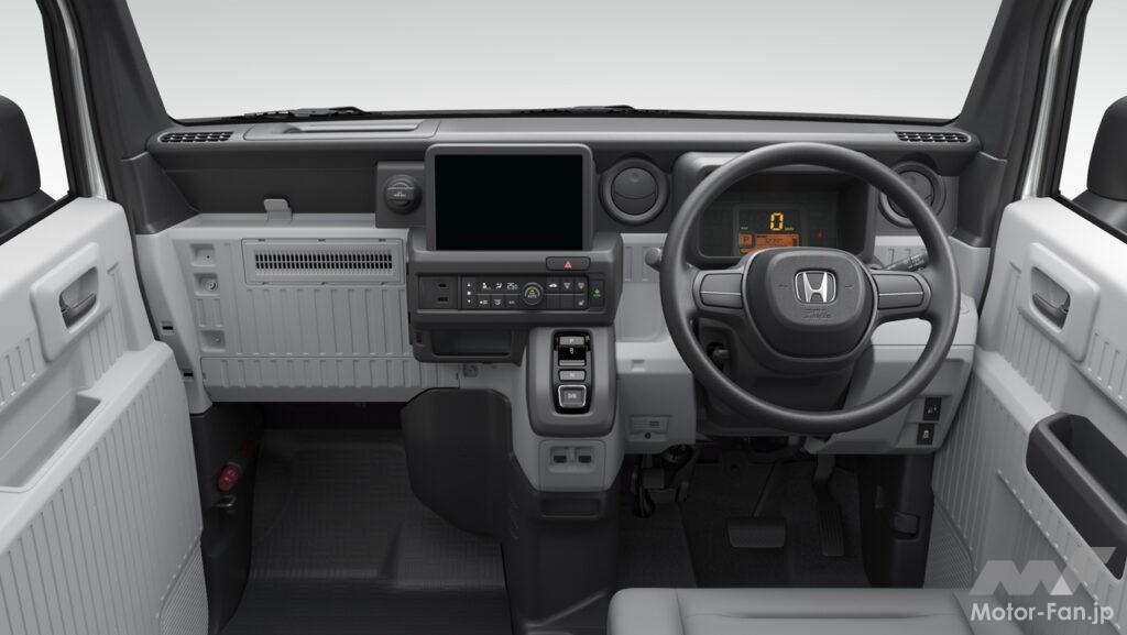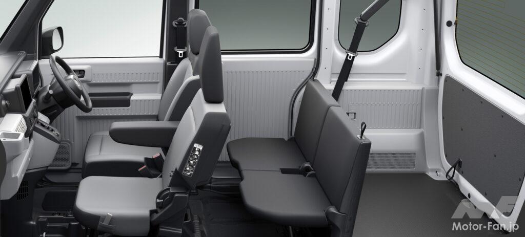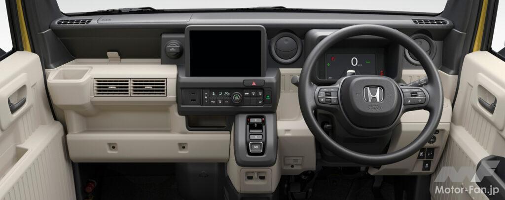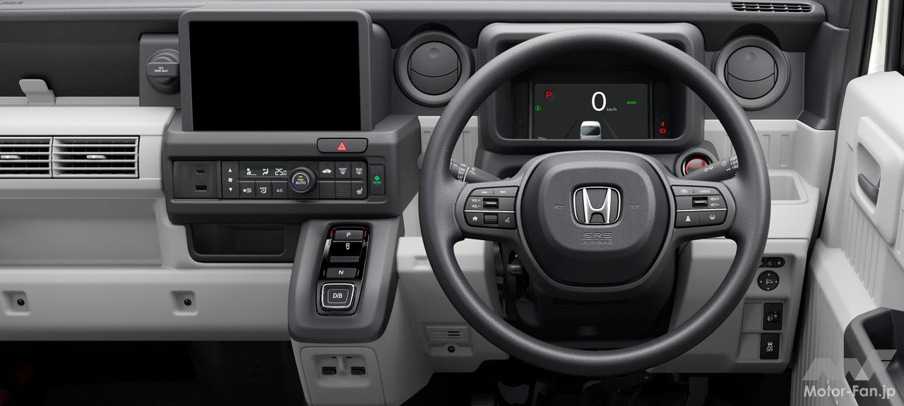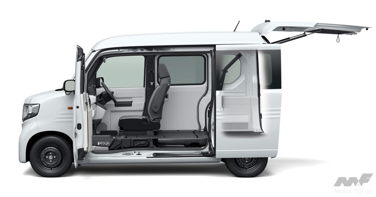 フラットで低い床と高い天井がもたらす広く大容量な荷室空間、助手席側のセンターピラーをなくした大開口部などの特長はそのままに、N-VAN e:には給電機能や静粛性など、EVならではの価値が加わった。大容量バッテリーの採用、電動アクスルの小型化、高電圧部品の集中配置による部品専有スペースの最小化などにより、商用ユースに求められる実用航続距離と大容量の荷室空間の両立を目指して開発された。