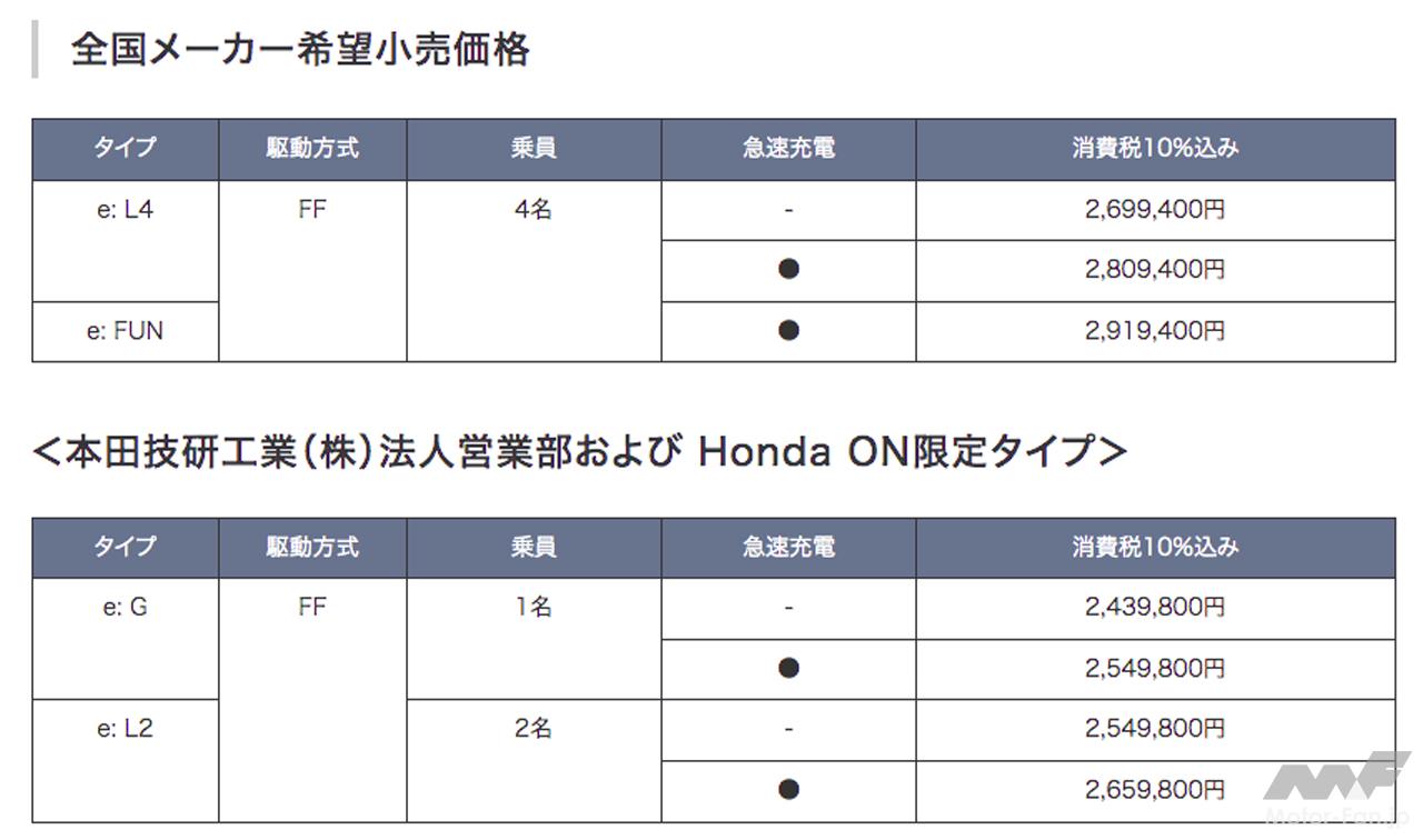 なお、e: Gとe: L2タイプは本田技研工業・法人営業部および新車オンラインストア『Honda ON』での販売限定で、リース契約のみでの取り扱いとなる。『Honda ON』での取り扱いについては、特設サイトにてご確認を。