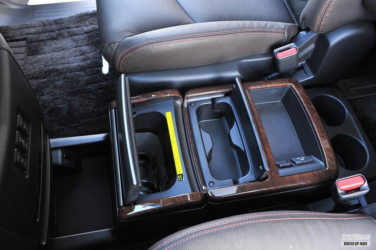 高級感漂うフロントのセンターコンソール。カップホルダーやトレイの他、オプションで冷蔵庫も選べる。