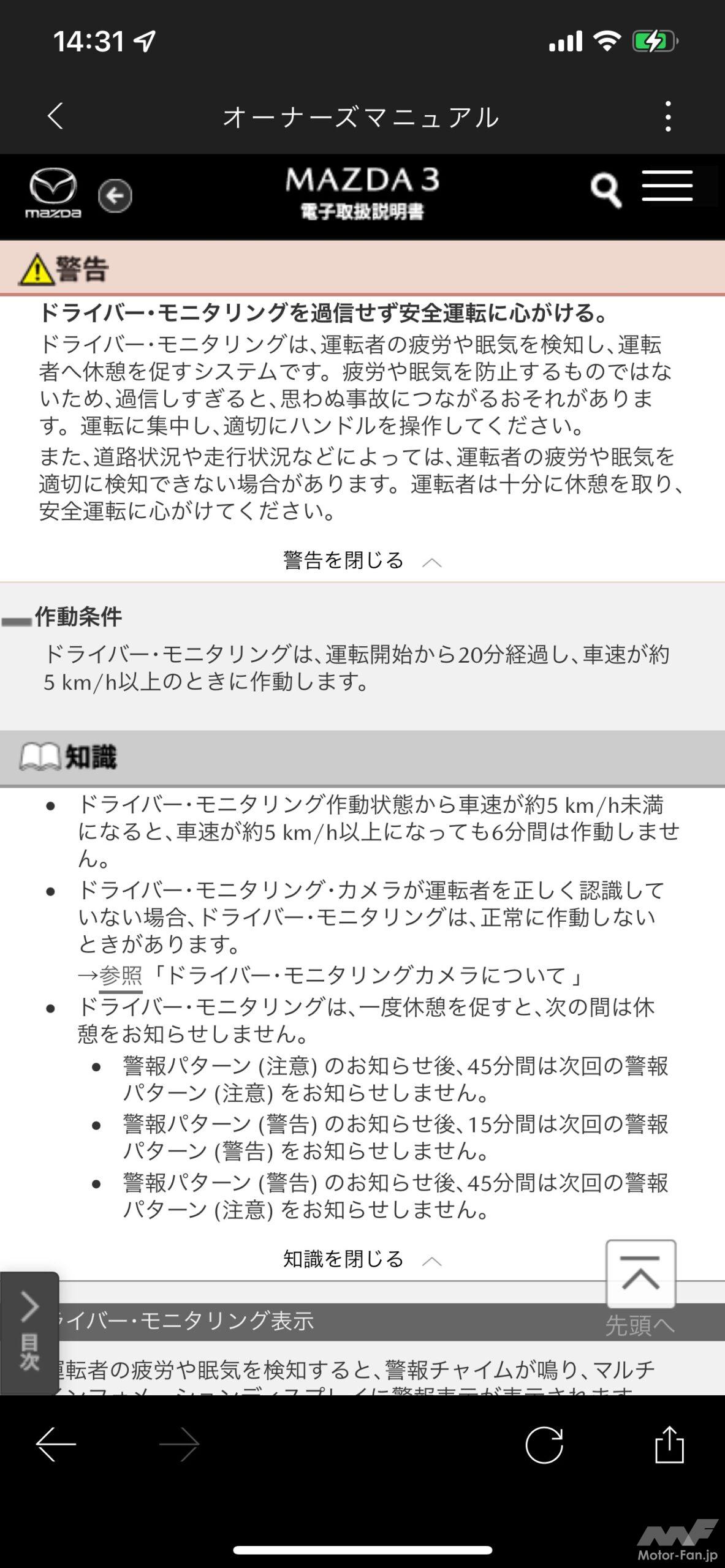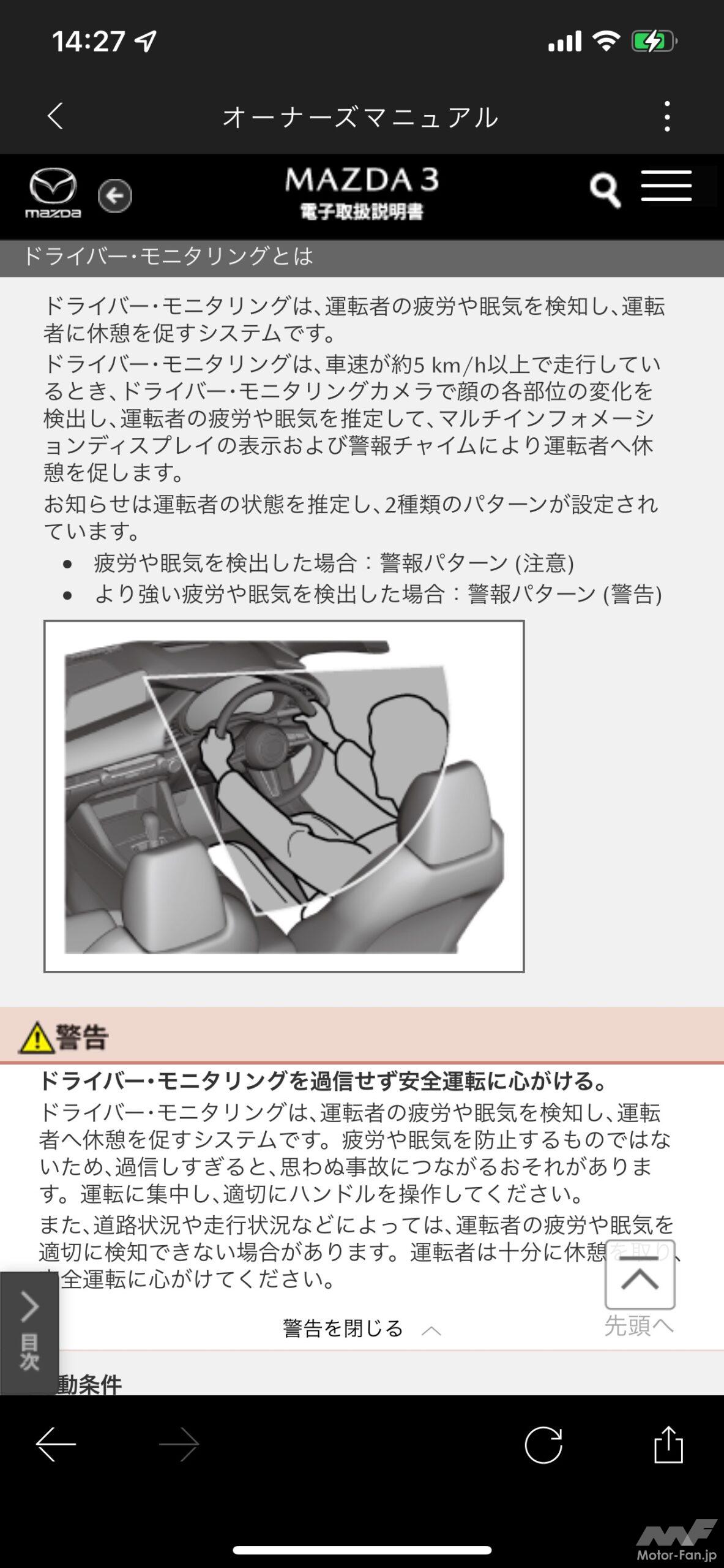 MAZDA3の「ドライバー・モニタリング」は、「360°セーフティパッケージ」のメーカーセットオプション扱いだ(筆者の仕様=X PROACTIVE Touring Selection の場合、8万6880円だった)。筆者は「360°ビュー・モニター」が欲しくて選択した(セットだったので、ドライバーモニタリングが一緒に付いてきた感覚だ)。メーカーの広報資料を引用して機能説明を行なうと、ドライバー・モニタリングの機能は以下のようになる。