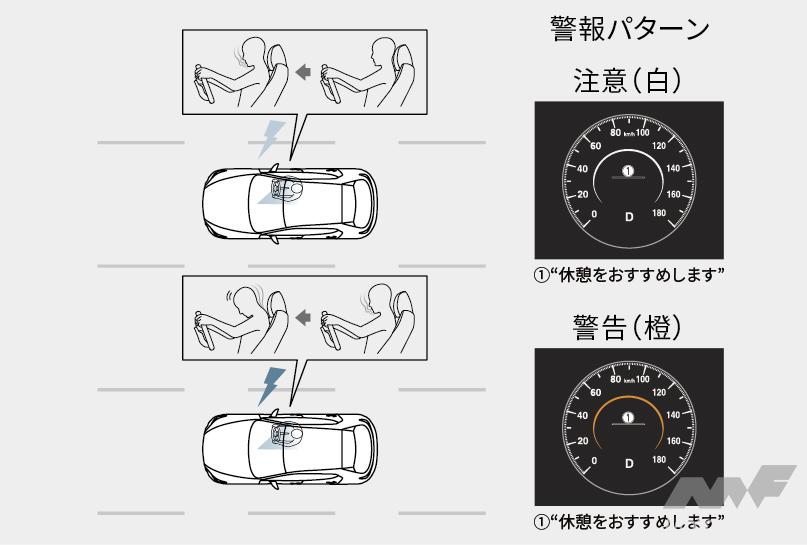 ドライバー・モニタリングが「かなり眠そう」と判断した場合は、警報チャイムを鳴らし、スピードメーターの内側に「休憩をおすすめします」というメッセージが表示される。この段階は「注意」で、メーター表示は白だ。システムが「非常に眠そう」と判断した場合は、いつ事故が起きてもおかしくない状態のため、ワンランク強い「警告」を発する。表示されるメッセージに変わりはないが、警報音はより強くなり、メーター表示はオレンジになる。