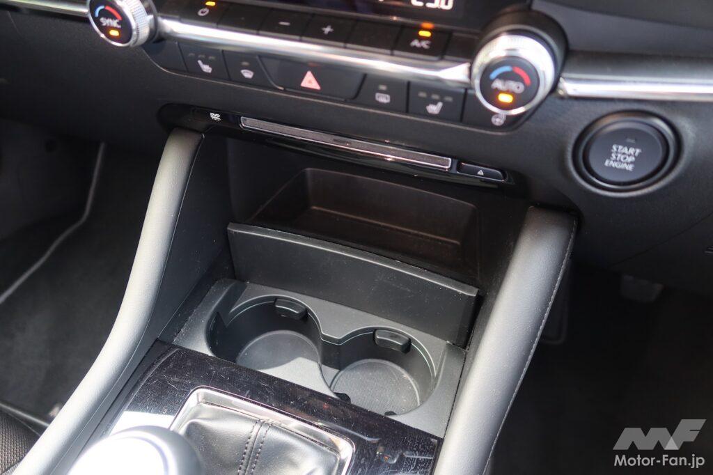 Apple CarPlay(有線および無線)に対応したのは、iPhoneユーザーの筆者にとって歓迎すべき変更点であり、現行MAZDA3のユーザーがうらやましい。センターコンソールの前端にスマートフォンのワイヤレス充電機能が設けられたのも、今回の商品改良で進化したポイント。この変更に合わせてフタ付きだったカップホルダーがフタなしになった。