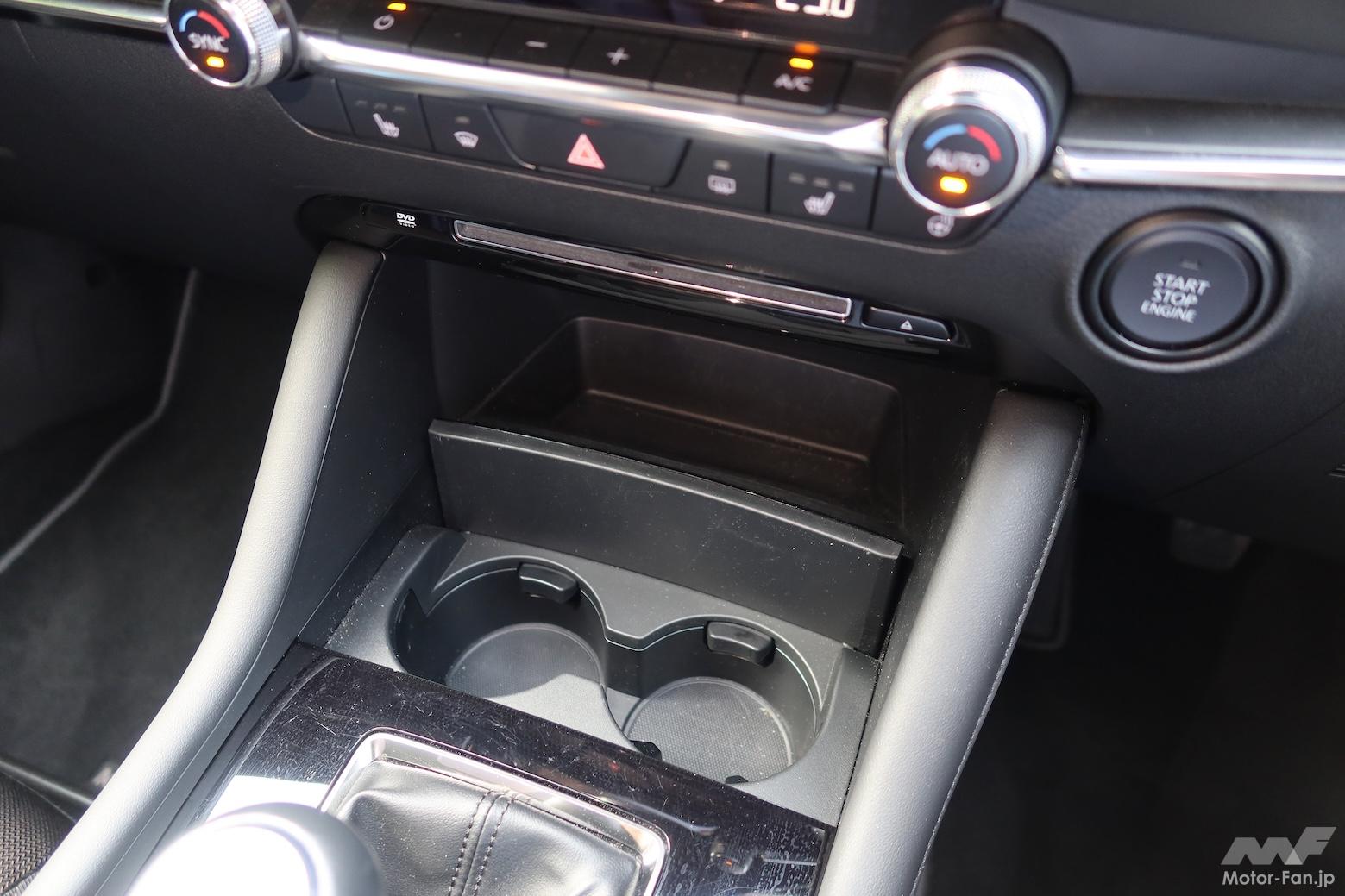 Apple CarPlay(有線および無線)に対応したのは、iPhoneユーザーの筆者にとって歓迎すべき変更点であり、現行MAZDA3のユーザーがうらやましい。センターコンソールの前端にスマートフォンのワイヤレス充電機能が設けられたのも、今回の商品改良で進化したポイント。この変更に合わせてフタ付きだったカップホルダーがフタなしになった。