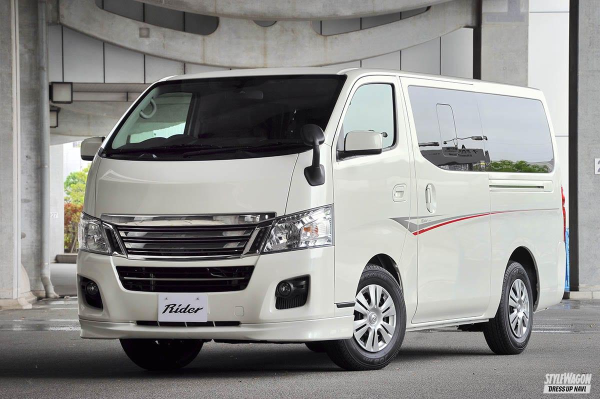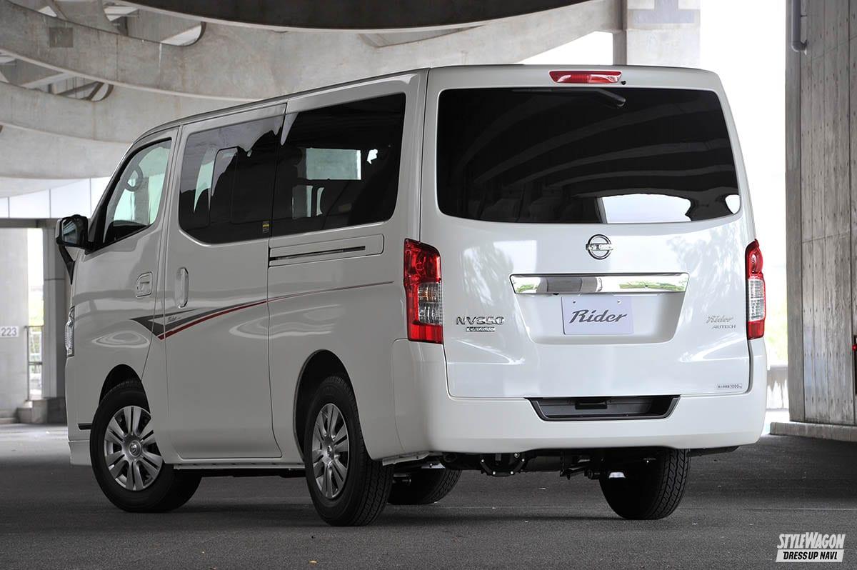 NV350キャラバンの本命はコレ! といっても過言ではないのがライダーだ。もはやお約束のライダー顔を決定づける専用フロントグリルは、左右端にLEDデイタイムライニングライト(オプション/インテリアパッケージ車は標準)をビルトイン。バンパー形状は他と同一ながら、インテーク中央部に専用バンパーモール、下端にプロテクターを装着し、強いインパクトを放つフロントビューを形成する。リアには専用エンブレムが付き、サイドは専用デカール(オプション)が用意されている。ベース車はバンのDX/プレミアムGXとワゴンのGX。本革巻ステアリングや防水シート地などを装備するインテリアパッケージはプレミアムGXに設定。