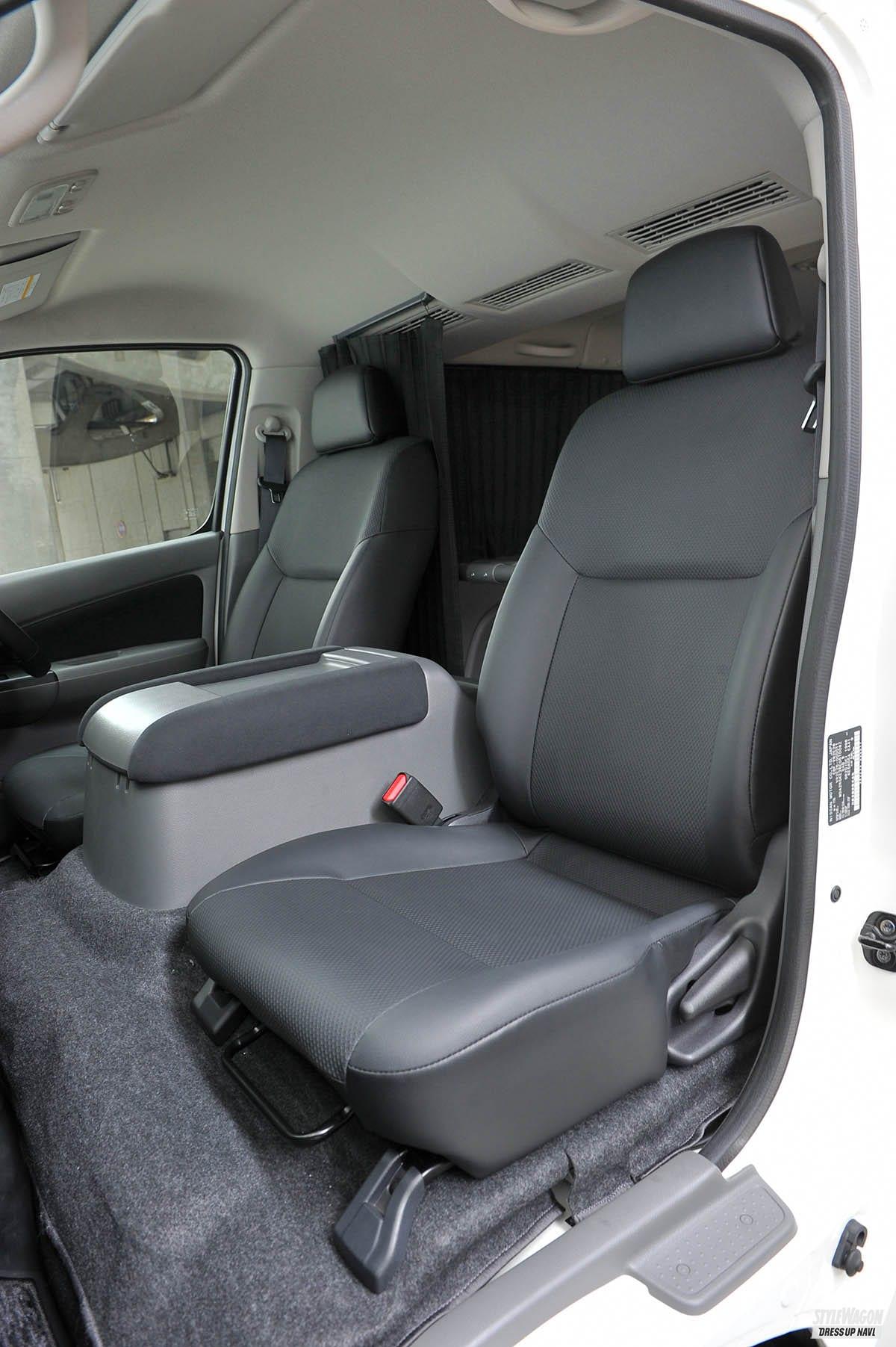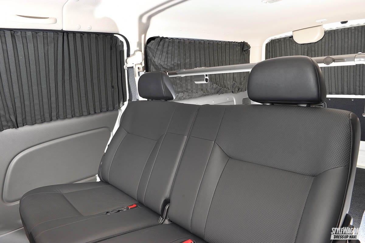 ブラック&グレーのコーディネーションを採用したバン・プレミアムGX。センターコンソールも大きい。リアシートは5:5の分割可倒タイプ。