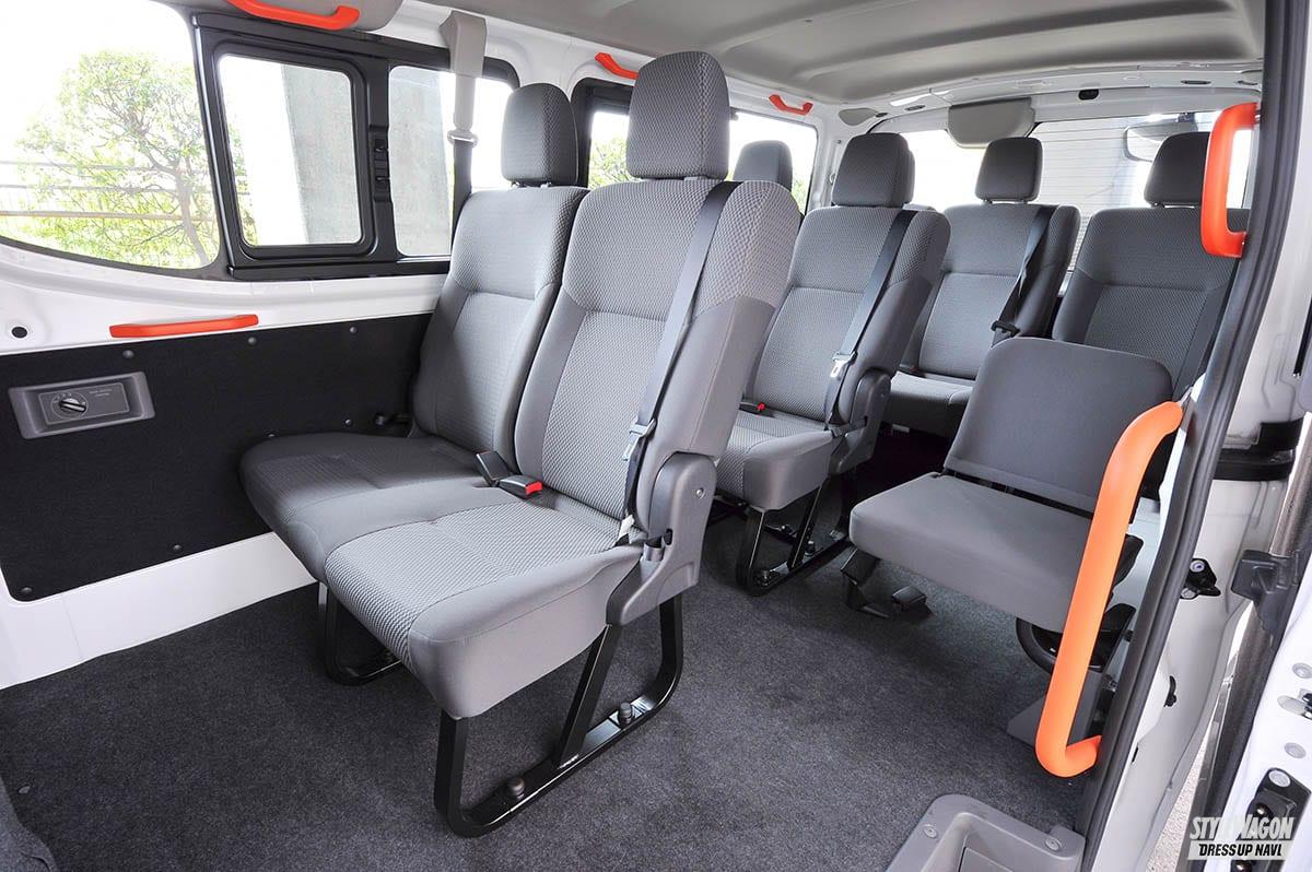 「アンシャンテ送迎タイプ」は「GX・スーパーロングハイルーフ10名乗り」と「DX・ロングボディ標準ルーフ10名乗り」(写真)の2タイプがベース。2+3+3+2のシートレイアウトになる。