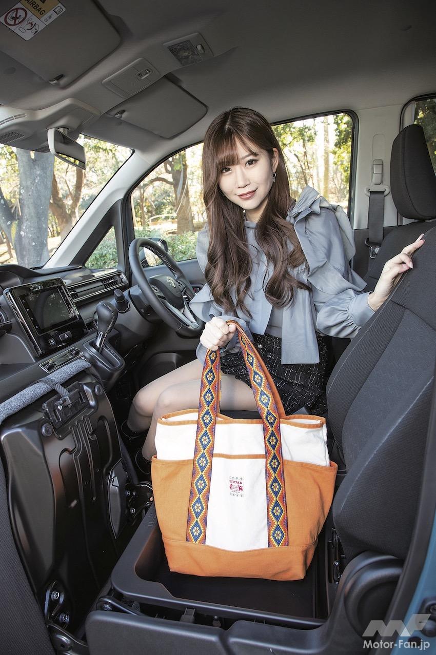 使い勝手の多彩さもライバル他車をリードするポイント。後席は全グレードが5対5の分割可倒&160㎜のスライド付きで、折り畳んだ際にはシートクッションごと下降するダイブダウン式だから、荷室との段差が付かない。助手席背もたれは前側に約90度まで倒せて、2mくらいの長い物まで積載できる。加えて助手席のクッションを前側に引き起こすと、樹脂製の四角いボックスが入っている。取り外しできるのでバケツとして使えるだけでなく、運転専用の靴や折り畳み傘、子どもの砂遊び用おもちゃなどを入れておくなど、結構便利に使えるのだ。