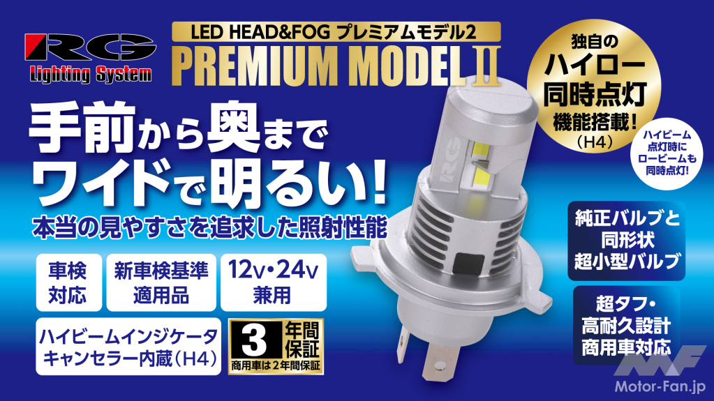 LEDヘッド&フォグ・プレミアムモデル2は、H4タイプ・ハイロー同時点灯機能、完全配光を実現。ロービーム時は手前から奥までワイド配光で明るく照射。ハイビーム時はロービームも同時点灯させ、暗くなる手前も明るくカバーする。