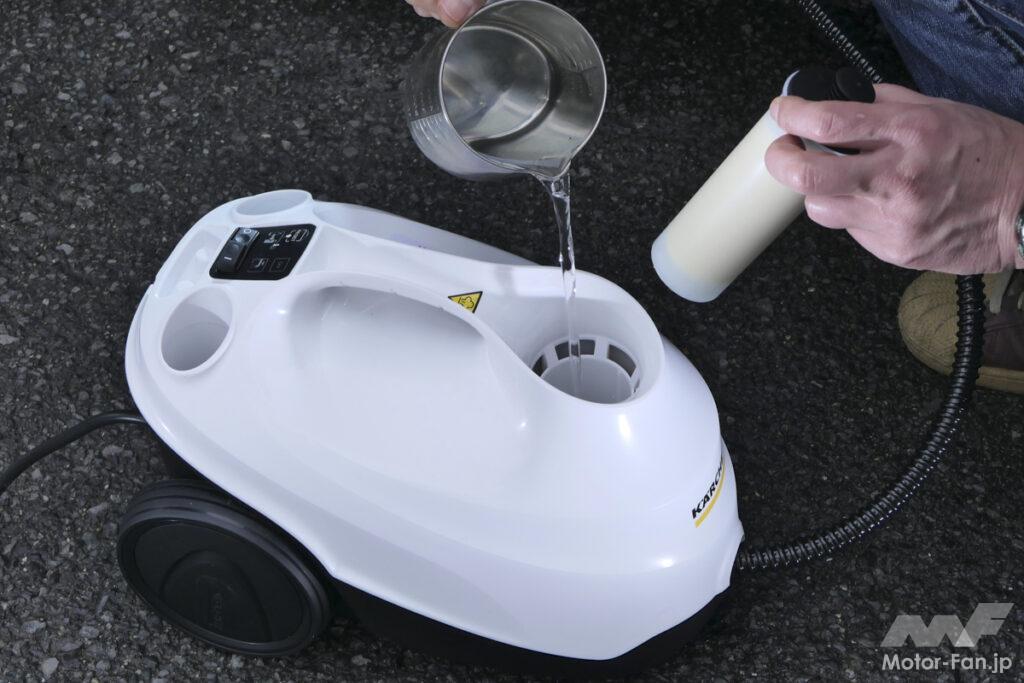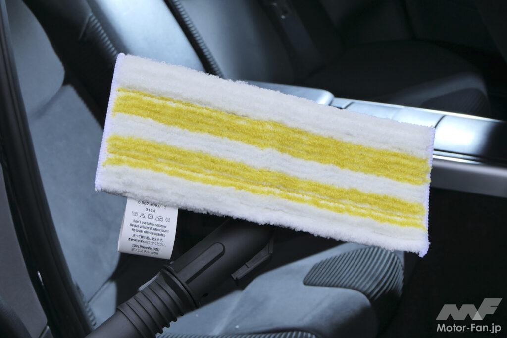 あとはレバーを握れば、ノズルからスチームが噴射される。スイッチで噴射の強/弱の切り替えも可能だ。そのスチームを清掃したい場所に当てると、汚れが浮き上がってくるので、クロスなどでそれを拭き取るという手法で清掃する。ノズル先端には掃除する箇所に合わせたアタッチメントを装着して容易に清掃できる。