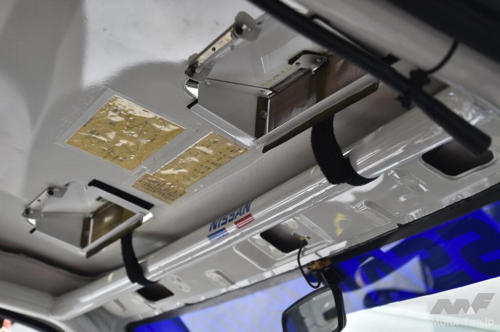 電装系でも、ECM内部は基盤に接続された素子類がラリーの振動やアクシデント時に外れることが無いよう樹脂で固められたいたそうだ。また、センターコンソール裏のブレーカーパネルなど、ハーネス類は極めて整然と配置した上で、こちらも外れないようにしっかり固定されているなど、ラリーフィールドで戦うクルマとして作り込まれていたという。