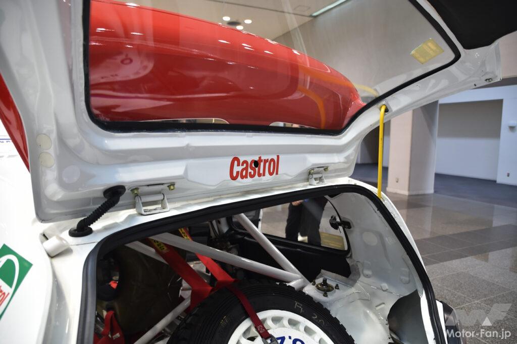 再生にあたっては、単に綺麗にするのではなく「ゴールした状態のまま」を基本に行われた。とはいえ、グループAラリーカーゆえのスペシャルパーツも多く苦労を重ねることになった。意外にも、この当時の写真や映像資料が少なくステッカー等の復元も難しかったという。特にリヤまわりは資料や写真が少なかったそうだ。