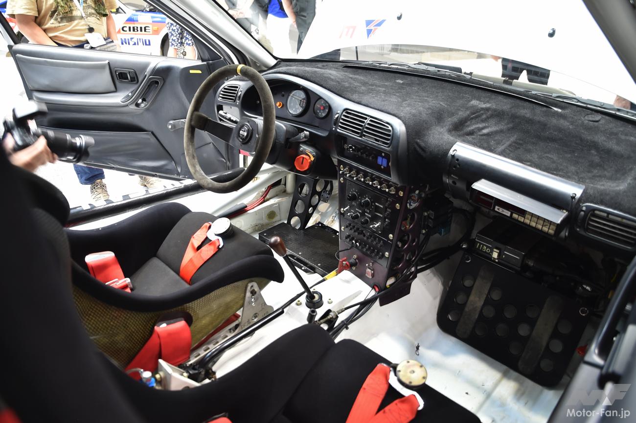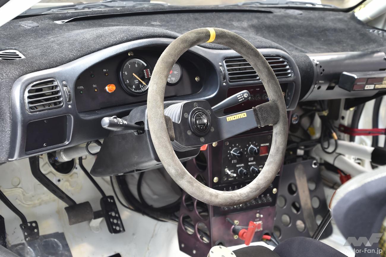 グループA時代のWRCマシンのコックピットはダッシュボードやドアの内張が市販車のまま残されているなど、意外とノーマルの雰囲気を感じさせる。一方で、ホワイトボディ剥き出しにロールケージを張り巡らせ、シートはフルバケットタイプ、内装はほとんど剥がされた空間はまさに競技車両であることを強く感じさせる。
