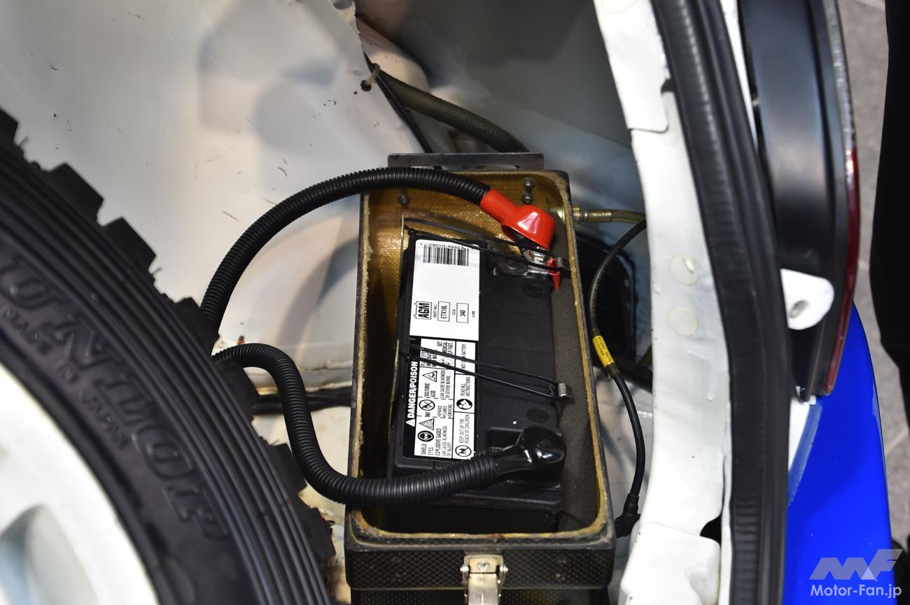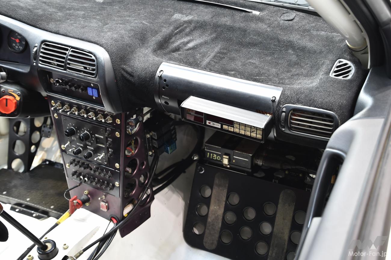 電装系でも、ECM内部は基盤に接続された素子類がラリーの振動やアクシデント時に外れることが無いよう樹脂で固められたいたそうだ。また、センターコンソール裏のブレーカーパネルなど、ハーネス類は極めて整然と配置した上で、こちらも外れないようにしっかり固定されているなど、ラリーフィールドで戦うクルマとして作り込まれていたという。
