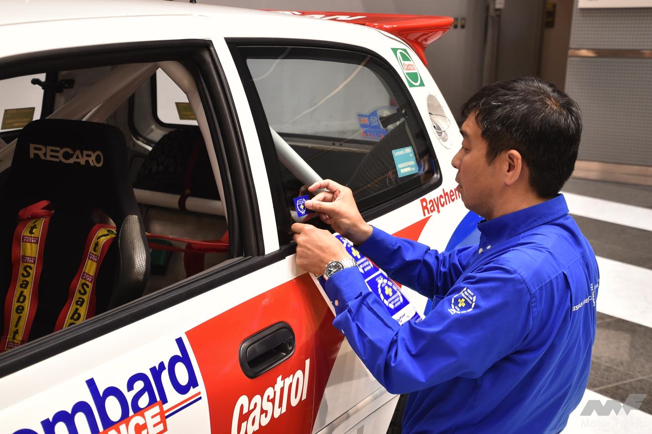 日産名車再生クラブでは、再生を完了した車両にその記念ステッカーを貼る。完了式で再生についてひと通りの紹介を終えたあと、クラブ代表の木賀新一氏が車両の左クオーターウインドウにステッカーを貼った。