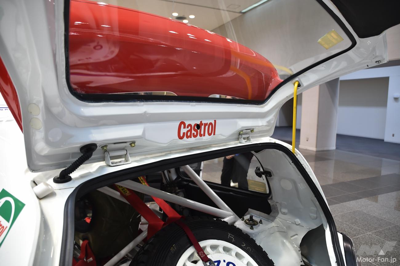 再生にあたっては、単に綺麗にするのではなく「ゴールした状態のまま」を基本に行われた。とはいえ、グループAラリーカーゆえのスペシャルパーツも多く苦労を重ねることになった。意外にも、この当時の写真や映像資料が少なくステッカー等の復元も難しかったという。特にリヤまわりは資料や写真が少なかったそうだ。