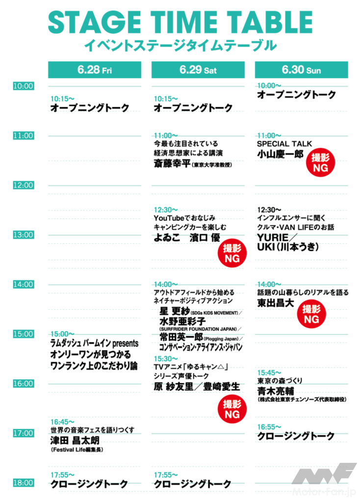 ■6月30日(日) ●10:00~ オープニングトーク ●11:00~ SPECIAL TALK 出演:小山慶一郎 ※撮影NG ●12:30~ インフルエンサーに聞くクルマ・VAN LIFEのお話 出演:YURIE UKI(川本うき) ●14:00~ 話題の山暮らしのリアルを語る 出演:東出昌大 ※撮影NG ●15:45~ 東京の森づくり 出演:青木亮輔(株式会社東京チェンソーズ代表取締役) ●16:55~ クロージングトーク