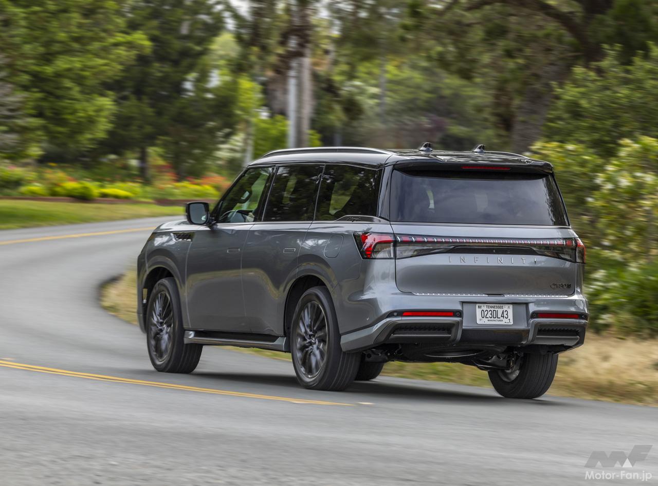 ボディサイズは全長5362×全幅2116×全高1946mmで、ホイールベースは3073mm。エクステリアデザインは、インフィニティのデザインフォーム「Artistry in Motion」を体現し、徹底的に細部にこだわっている。竹林をイメージしたフロントグリルメッシュ、さざ波にきらめく光の反射を模したテールライト、日本の石庭にヒントを得たラバーインレイなど、随所に自然が作り出すフォルムを取り入れた。