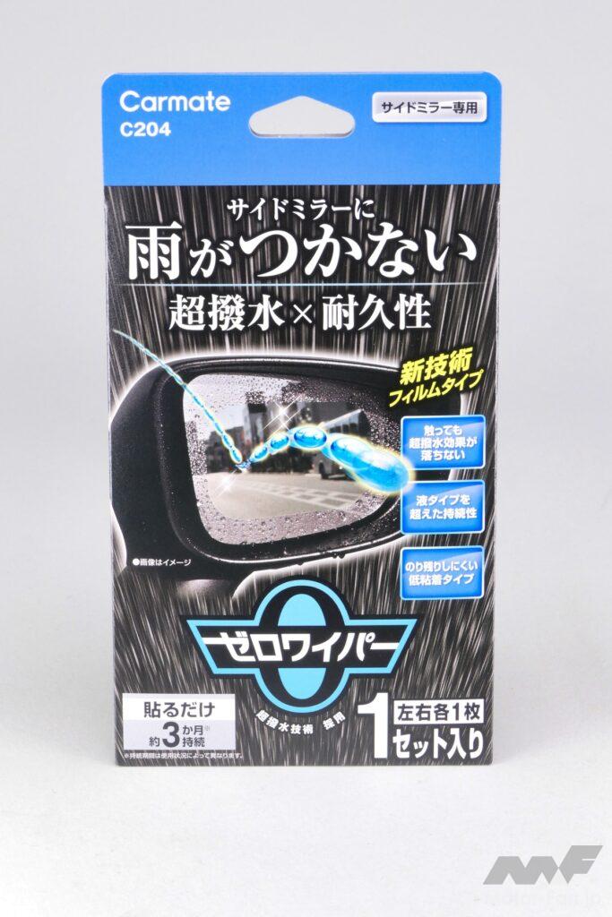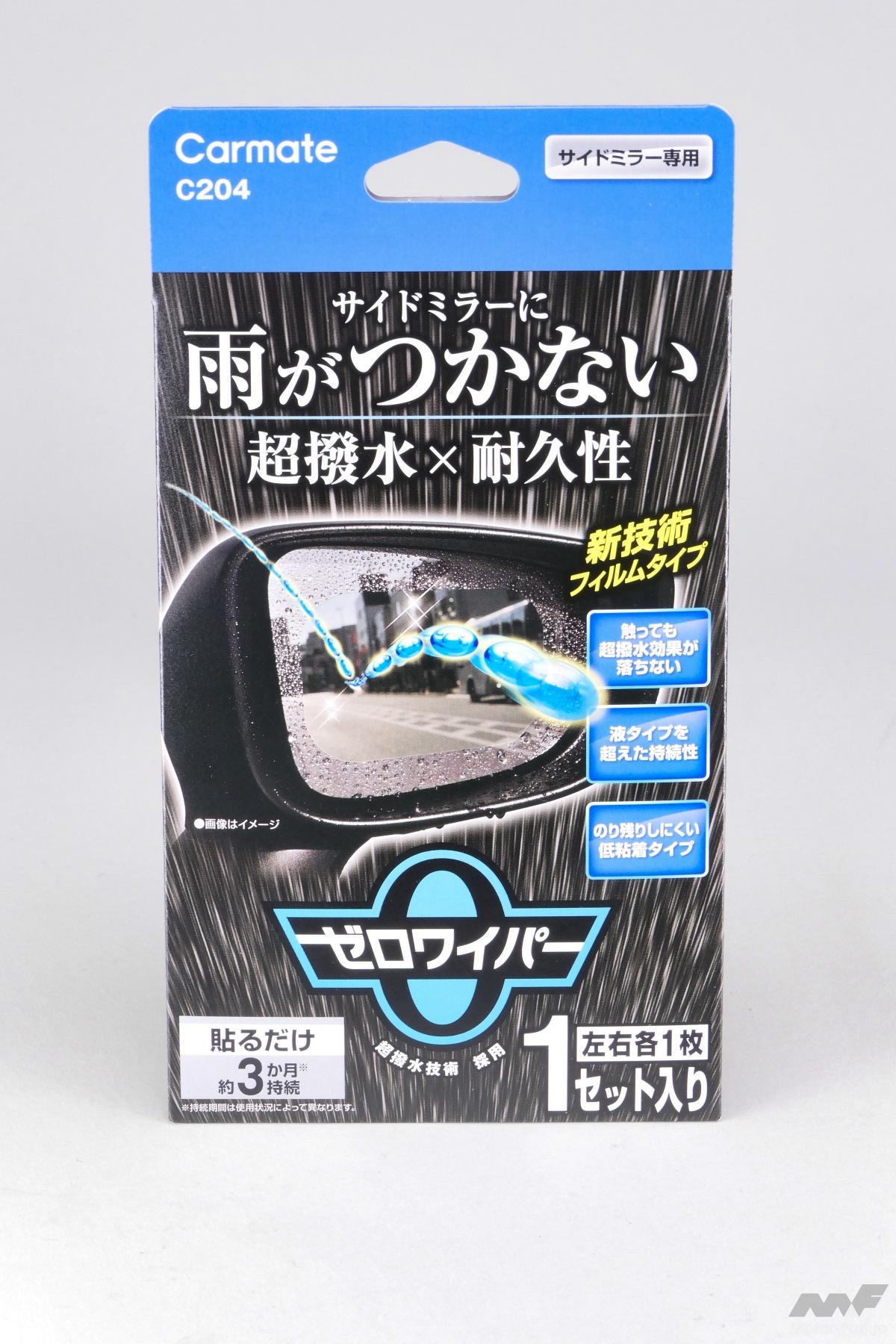そこで紹介したいのが、カーメイトが新たにリリースしたサイドミラー用の超撥水フィルムだ。その表面には目に見えないレベルの超微細な突起が形成されており、水滴を弾くため雨水をまったく寄せ付けない。いわば親水状態のようになるというわけ。